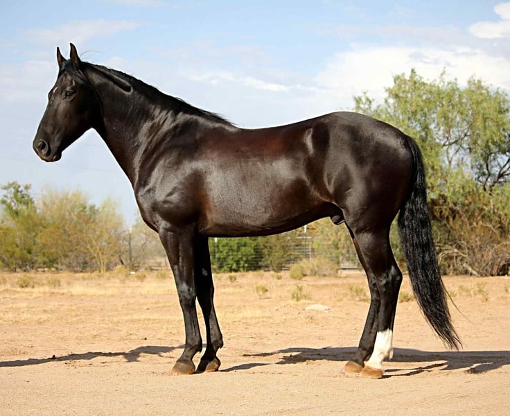 ONLINE AUCTION Place your bids at www.PlatinumEquineAuction.com Starting Bid $3500 Auction ends January 4th, 2025 Need a new saddle? Check out White Rock Saddles on our website or Facebook Beauty, brains and versatility… Odie has it all! This sweet gelding is a 6 year old Friesian QH cross gelding standing a stout 15.1 hands tall. He has a stunning jet black coat and turns heads everywhere he goes. Odie is the type of horse that wants to be your best friend, he has an in your pocket personality and loves getting attention and being loved on. He’ll be the first one to greet you at the gate! Odie has done a little of everything. He has roped and dragged the dummy, pushed cattle, given riding lessons, trail rides and even started riding English. He also rides bareback and is very comfortable with his smooth gaits. Out on the trails Odie is confident and happy to go wherever he is pointed. He will cross brush and logs, go up and down the washes and is also comfortable on the streets as well. He has been ridden out alone as well as in groups. He is not a barn or buddy sour horse at all. Odie is gentle and safe, taking care of his rider in all environments. He has been exposed to tractors, dogs, traffic, and all the crazy things that come with small children such as bikes and mini four wheelers being driven through the barn aisle. On the ground Odie has great ground manners. He stands tied quietly, loves baths, good for the vet and farrier and loads and hauls nicely. He has no vices and is an easy keeper and requires no maintenance. Odie is ready to find his own adventure partner and best friend, he will give you 100% of his heart each and every day! Please feel free to call or text Claire Siebols at 435-899-0508 with any questions about this sweet boy! He is located in Marana, Arizona and we are also happy to help arrange transport anywhere needed! ONLINE AUCTION Place your bids at www.PlatinumEquineAuction.com Starting Bid $3500 Auction ends January 4th, 2025 Need a new saddle? Check out White Rock Saddles on our website or Facebook