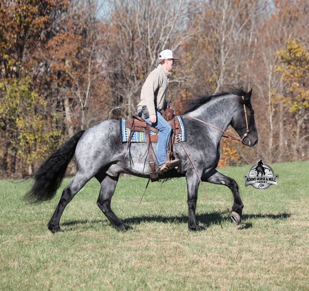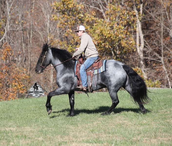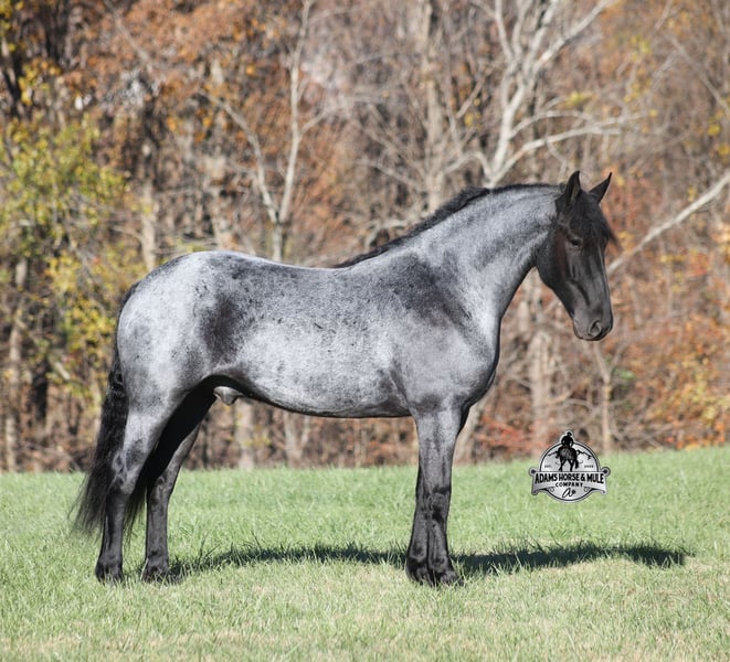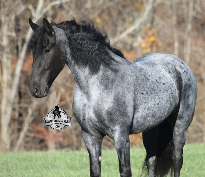 𝐀𝐝𝐚𝐦'𝐬 𝐇𝐨𝐫𝐬𝐞 & 𝐌𝐮𝐥𝐞 𝐂𝐨𝐦𝐩𝐚𝐧𝐲'𝐬 ✷𝑬𝒗𝒆𝒓𝒚 𝑴𝒊𝒍𝒆 𝑨 𝑴𝒆𝒎𝒐𝒓𝒚✷ 𝐄𝐗𝐂𝐋𝐔𝐒𝐈𝐕𝐄 𝐒𝐀𝐋𝐄 Happening now thru MONDAY | FEBRUARY 2nd - Available EXCLUSIVELY on HorseBid's website! For more details and to register visit: www.Horsebid.com CONSIGNOR CONTACT: Adams Horse and Mule Company 606-308-2461 LOCATION: Mt. Vernon, KY BREED: Friesian Heritage Horse REGISTERED: Yes REGISTERED NAME: RRS Trumpin Travis COLOR: Blue Roan HEIGHT: 16.1 AGE: 6 GENDER: Gelding Sweet dreams are made of this!!! RRS Trumpin Travis is the big, stout, true blue roan registered Friesian Heritage Horse Gelding!!! He is a 16.1h+ and is a 2019 model. Travis he is a very smooth mover as he, takes the correct leads, lopes nice circles, reins around and stops with ease! Travis is safe for any level or any age of rider!! He has been ridden by our kids with no issues. Travis has been ridden inside and out. He is good in the arena, he has been ridden down the highways and he is traffic safe. Travis is great on trails and he will cross creeks, ditches, logs and navigate rough rocky areas. He has been exposed to all kinds of wildlife such as deer or turkey and will go anywhere that he is asked too. He has been ridden many miles in the mountains of Eastern Kentucky and encountered every obstacle possible on the trail. He has been on several week-long camping trips. He hauls well and picketline ties also. He will go up or down even the steepest slopes, across deep creeks, over downed trees, and over all types of rough terrain while still being sure footed. Travis has no bad habits! In addition to riding, Travis has been drove single, double and in a 4 horse hitch pulling an old west stage coach! He has been worked in all types of farm machinery, has been drove through town, in parades and at rodeo venues. Travis’s mate (Trevor) is also available. You don’t want to miss this special horse! Feel free to call Eric 606-308-2461 with any questions.
