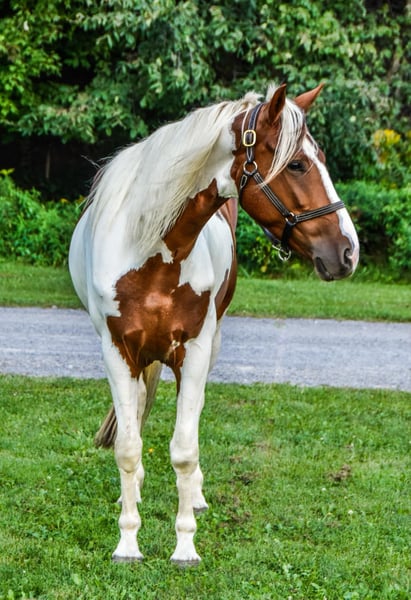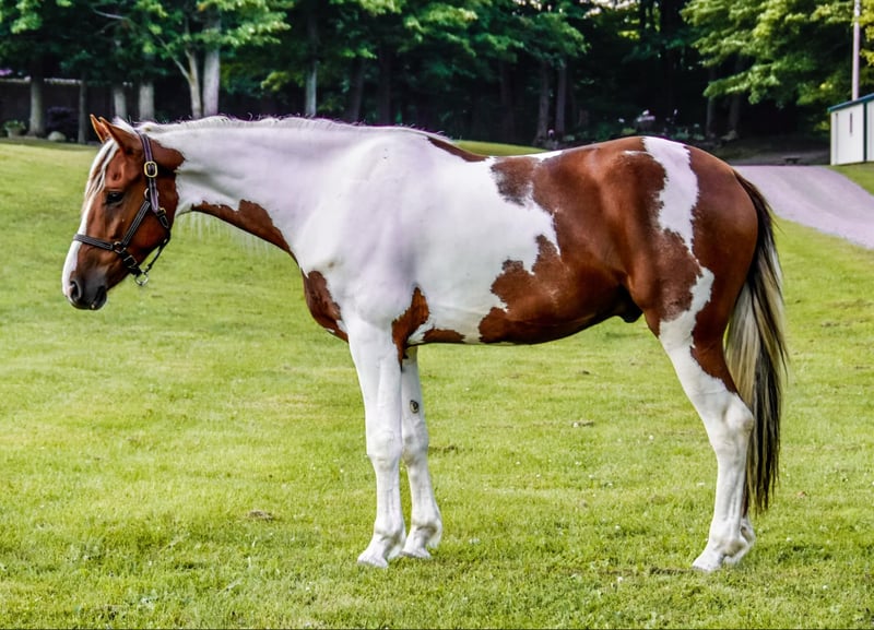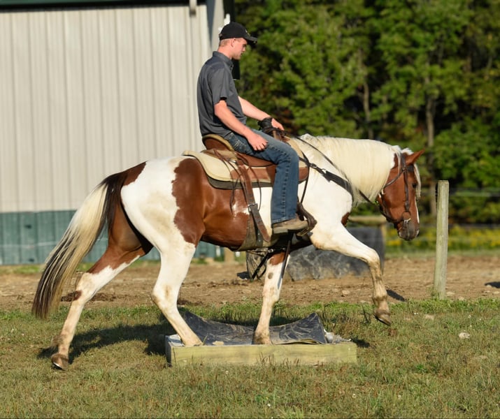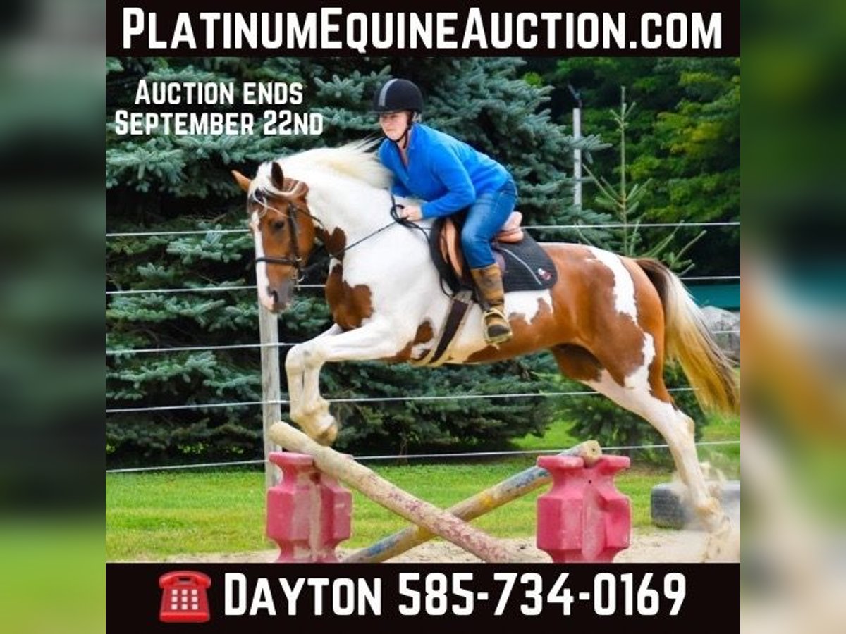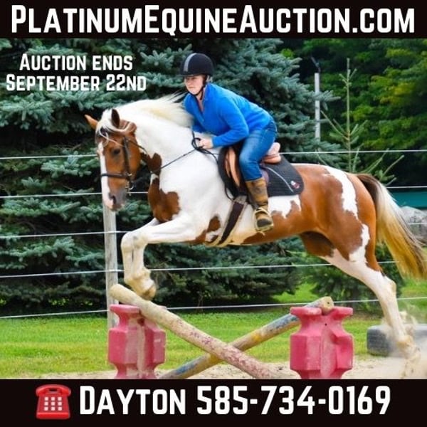 ONLINE AUCTION Place your bids at www.PlatinumEquineAuction.com Starting Bid $3500 Auction ends September 22nd, 2024 Need a new saddle? Check out White Rock Saddles on our website or Facebook! Chrome is a stunning 4-year-old Friesian/ Paint cross gelding standing at 15.1 hands. He is the type of horse that loves attention. Chrome rides English and Western and has a great handle and stunning gaits. He has a smooth walk, trot, canter, backs, and knows how to use his body. He will ride in a snaffle and has a very soft mouth. Chrome is extremely athletic and very light on his feet. He enjoys strolling along the trails or in the arena, but he is equally prepared to take a jump like a warmblood. He has lots of hind-end power and loves to jump! Chrome is safe both on the ground and under saddle. Kids, teens, and adults have ridden him, and they all enjoy him; he can take a joke and will try anything you ask! He is a trail rider’s dream horse; point him in any direction, and he’s going there. He will walk down the trail on a loose rein, cross any water and logs, and climb any hills you may encounter. He will ride with a group or by himself just the same, and is happy go lucky and always up for an adventure. He’s confident and sure-footed, making him the ultimate trail companion in any terrain. He is an absolute statue for the farrier and has excellent feet, but we keep him shod all the way around because of our terrain. Dogs, cows, sheep, goats, and donkeys don’t bother him. If you are looking for a SAFE and even-tempered horse that the whole family can enjoy and who has his whole life ahead of him, then Chrome is it! He is UTD on all shots and has a current coggins. He sells with no vices. PPE are welcomed at potential buyers expense. Contact Dayton Wolcott 585-734-0169 for more information. Located in Warsaw, NY. ONLINE AUCTION Place your bids at www.PlatinumEquineAuction.com Starting Bid $3500 Auction ends September 22nd, 2024 Need a new saddle? Check out White Rock Saddles on our website or Facebook!