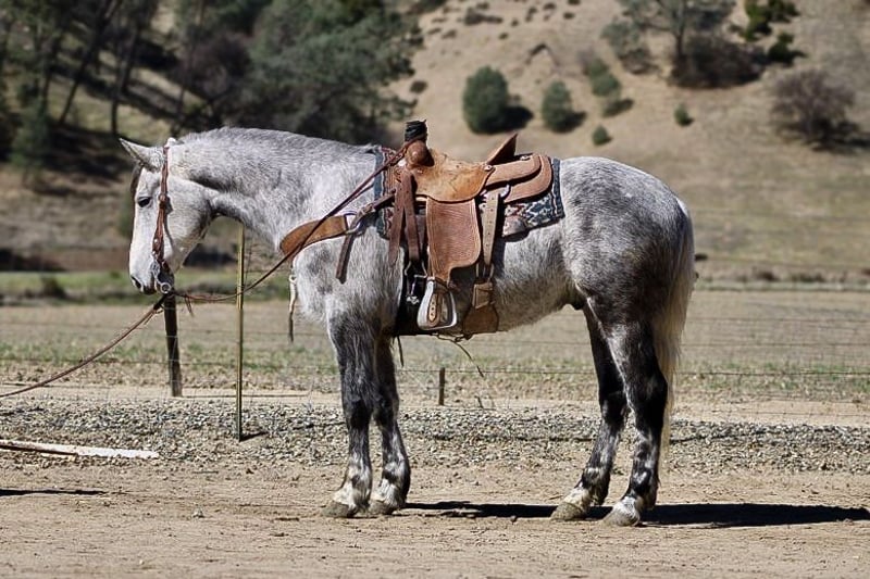 ONLINE AUCTION Place your bids at www.PlatinumEquineAuction.com Starting Bid $3500 Auction ends March 16th, 2025 Need a new saddle? Check out White Rock Saddles on our website or Facebook! Cosmo is a stunning dapple grey draft cross that is waiting to become your new best friend. At 6 years old, standing at 15 hands with a big thick bone and solid foot, he has the perfect combination of beauty and build. It’s impossible not to fall in love with this sweet boy. One of Cosmo’s strongest qualities is his ability to be an excellent trail partner. He navigates any terrain with ease and is sure-footed on even the most challenging trails. Ditches, brush, and wildlife are all just a part of his routine. You can trust him to take you safely up or down any trail without hesitation. In the arena, he has a comfortable trot, smooth lope, and a picture-perfect sliding stop. He has also been introduced to trail obstacles and he confidently tackles bridges, tires, and even walking through a car wash. We have also taken Cosmo out to gather cattle and check pastures. He takes each outing in stride and seems to truly enjoy every adventure we take him on. This friendly horse will meet you at the gate with excitement and loves nothing more than getting pampered especially with belly scratches. Cosmo is an absolute pleasure to handle as well. He stands patiently for clipping and bathing, ties quietly, loads easily into trailers, and hauls like a pro. We have even ridden him down busy streets where he didn’t bat an eye at passing cars or trucks. With his pretty movement, Cosmo would look stunning in English tack too. Whether you’re looking for a reliable trail horse or one that excels in different riding disciplines, this boy is truly versatile. If you want an easy-going horse that anyone can ride, then Cosmo is definitely the rare find you’ve been searching for. He thrives in both pasture settings or stalls; it doesn’t matter to Cosmo as long as he has a loving home. If you’re ready for lifelong adventures with your next equine partner, then Cosmo is the perfect match for you. Please contact us at Longhorn Ranch and ask for Dina at 831-537-1915. We are located in Paicines, California, and would be more than happy to introduce you to this incredible horse. ONLINE AUCTION Place your bids at www.PlatinumEquineAuction.com Starting Bid $3500 Auction ends March 16th, 2025 Need a new saddle? Check out White Rock Saddles on our website or Facebook!