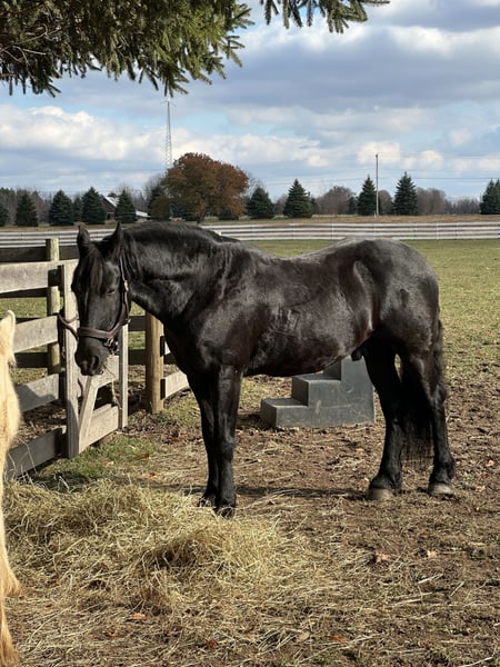 "AVAILABLE ON ONLINE HORSE AUCTION AT www DOT MagicHorseAuction DOT com BIDDING OPEN NOW thru TUESDAY |February 17th! - BUY IT NOW AVAILABLE! *Final price will be determined on auction site* CONSIGNOR CONTACT INFO: Cindy Schie #716-200-2937 LOCATION: Akron, NY" Onyx also known as Blackhawk is a 6-year-old registered Friesian/Pony gelding standing at 14.1hh. Well, broke to ride and drive. Rides both English and Western. Amazing arena horse! Lopes a circle nicely. Picks up walk, trot, and canter easily. Leg yields. Does great on obstacle courses.. Stands quietly and patiently at a mounting block. Stops and stands when asked. Picks up both leads correctly. Blackhawk would be a nice dressage prospect. Blackhawk has also been used on the farm. He has been on trails and will cross creeks, step over logs with ease, and climb any hill you ask him to. He does fine out in groups or out alone. He is traffic safe and will stand patiently while at stop signs. This pretty gelding also has excellent ground manners and has the sweetest personality. He is easy to catch in the stall and outside. Ties nicely on a lead line and in cross ties. He is easy to handle, even the kids can groom, tack, and get him ready to ride with no help from an adult. He stands well for the farrier and vet. Blackhawk loads well and remains quiet during hauling. He has a super sweet attitude and loves attention! Blackhawk sells a 100% sound with x-rays and PPE! Contact Cindy at 716-200-2937 for more information! Located in Akron,NY