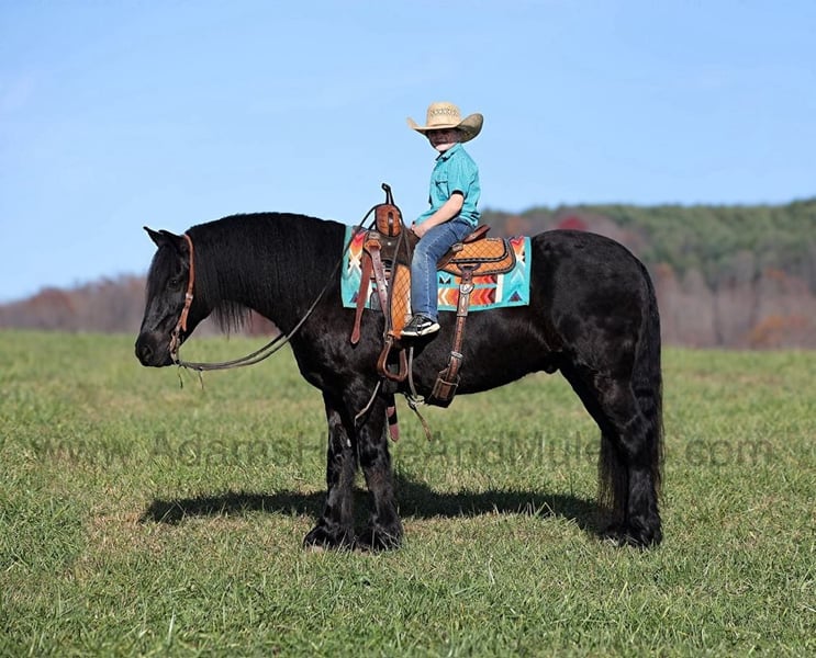 Go to visit our website for more pics and a video. AHAMC has been in the horse business and sold horses over the internet since 2005. We have a long track record of success with hundreds of happy customers. We work hard to match riders with the correct horses and specialize in beginner safe, family friendly horses that have been used and checked out by our family! Max is a 15hh, 6 yr old, JET Black registered Gypsy Horse. He is a half Gypsy Vanner and a half Friesian… you get he best of both worlds with this guy, the looks, beautiful black coloring, lots of mane and tail with some feathering… Max is a well built gelding with lots of muscle! He has been ridden on a small cattle operation and although he hasn’t been a big time hardworking ranch horse he has toted the kids around the operation! Max has been camping and trail ridden in several states across the west and east as well. He will cross creeks, ditches, logs and navigate rough rocky areas. He is safe in traffic whether that be trucks or cars. He is safe for any beginner to ride and is sure to help build your confience levels. He will go up or down even the steepest slopes, across deep creeks, over downed trees, and over all types of rough terrain while still being sure footed. Max is not cinchy, cold backed, does not crib or weave. He has the looks, the right mind set and the expierience… Max is the horse of a lifetime! Feel free to call Eric 606-308-2461 any questions.