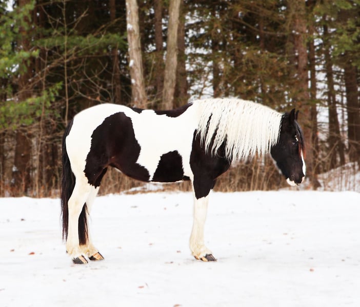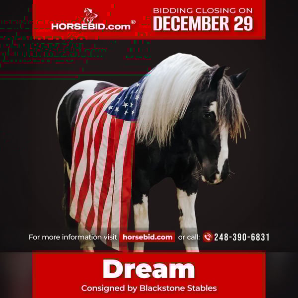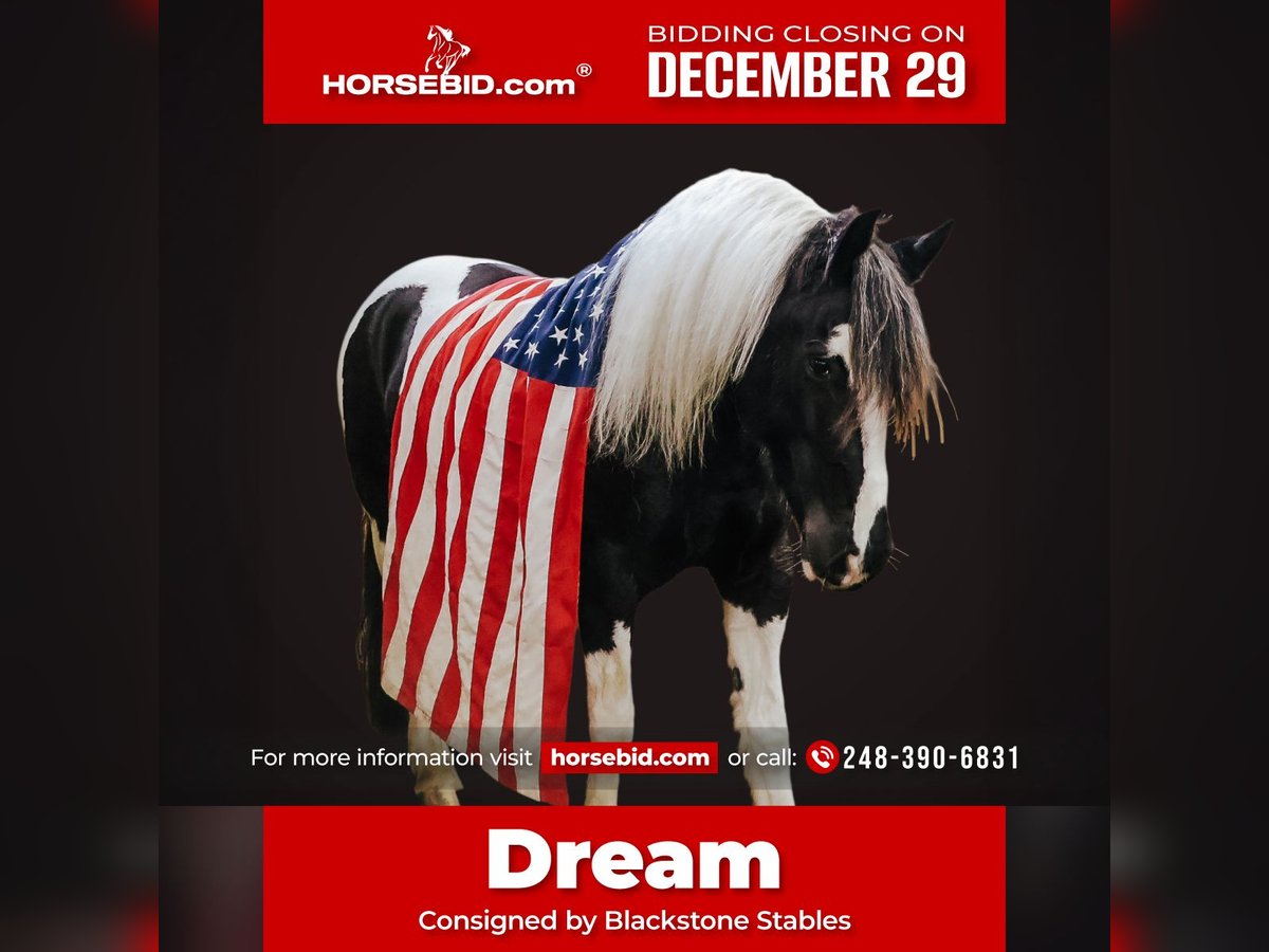 ⚜️𝐓𝐇𝐄 𝓗𝓮𝓻𝓲𝓽𝓪𝓰𝓮 𝐖𝐢𝐧𝐭𝐞𝐫 𝓒𝓵𝓪𝓼𝓼𝓲𝓬⚜️ Happening now thru MONDAY | DECEMBER 29th - Available EXCLUSIVELY on HorseBid's website! For more details and to register visit: www.Horsebid.com CONSIGNOR CONTACT: Blackstone Stables 248-390-6831 LOCATION: Howell, MI BREED: Friesian Heritage Horse REGISTERED: Yes REGISTERED NAME: Hattie’s Moonlight Dream COLOR: Black and white paint HEIGHT: 15.1 AGE: 7 GENDER: Gelding Haite's Moonlight Dream, or Dream as we call her at home nothing short of spectacular from her mind to her color, to her breeding there’s nothing she’s lacking. Dream is a 15.1hh stout made, friesian heritage horse. she is sired by the legendary Haite fan North Ster and out of a paint Haflinger cross mare. She is 7 years old. Dream has an incredible mane and tail and light feathering. She has gorgeous conformation. Not only is as stunning as a horse who walked right out of a fairy tale she is sensible. Dream will walk, trot and canter with ease. All of her gaits are as comfortable as floating on a cloud. She has had years of natural horsemanship training and will ride completely tackless at the walk, trot, canter and even over jumps. She moves off of your seat and leg effortlessly. She has been in the city, in traffic, in the woods and in water. She has been in the arena and the fields. This girl will go anywhere with any rider onboard. She goes English, Western and even bare back. She knows how to drive and loves it. Dream has all the bells and whistles when it comes to her trick training. She will sit, lay down, say yes and no and will rear up on command. She listens to her persons ques with the most attention and respect. Dream has been trained by the absolute best in the business. She has seen tarps, umbrellas, balls, bridges, inflatable dinosaurs and much more. You will be hard pressed to spook her. This mare has been on several hunter paces. She has also been used to round cattle. In the arena she jumps in beautiful form. She has been to schooling shows and used in lessons for kids as young as 5 years old. This is a unique find that would be an asset to anyone looking for a feathered horse that anyone can get along with anyone in any situation. Dream has been a very loved family member only having one owner since she was a baby. She is only being offered for sale to the best of homes as her owner has a few upcoming babies to bring along. Please watch her video, she speaks volumes for her self. Please call or text Ellesse Schwartz at 248-390-6831. Dream lives in Howell, MI 48855