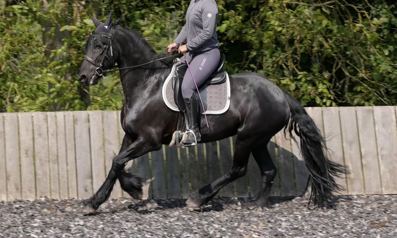 Vends ma douce jument Frisienne, née en 2015, mesurant 1,63 m. Wietske se montre confiante et sûre d’elle aussi bien en solo qu’en groupe lors des sorties en extérieur, et connaît également la carrière d’équitation. Elle marche au pas et au trot en exécutant tous les exercices de flexion et tous les allures de base sans problème. Wietske n’a aucune mauvaise habitude, elle est très douce en main et, grâce à son tempérament calme et plutôt détendu, elle convient aussi bien aux cavaliers débutants, aux enfants qu’aux cavaliers un peu plus nerveux. Si vous cherchez un cheval vif ou fougueux, elle ne sera probablement pas la meilleure option. Elle est actuellement dénuée de ferrure et évolue dans un troupeau mixte en paddock extérieur, mais elle a également connu la vie en box dans le passé. Son tempérament équilibré en fait une compagne idéale pour les cavaliers de loisirs. Wietske est malheureusement sensible à l’eczéma estival, elle doit donc être vermifugée et déparasitée régulièrement, et doit être déparasitée en été pour bien traverser cette saison. Elle est régulièrement vermifugée et suivie chez le vétérinaire pour ses soins dentaires. Pas d’offres de marchands, priorité au prix !