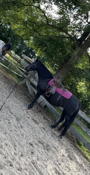 Sehr liebe und anhängliche Stute sucht ein liebevolles Zuhause mit einer festen Bezugsperson. Brav im Umgang und auch von Kindern geritten. Sehr weich und fein zu reiten, möchte gefallen. Braucht im Gelände einen Reiter der ihr Sicherheit geben kann; mit bekanntem Führpferd bei uns entspannt. Auch bei wenig Bewegung unterm Reiter lieb. Wurde stets freizeitmäßig Western geritten und in einer gemischten Herde im Offenstall gehalten. Schmiedefromm und frisch geimpft. Wird nur in allerbeste Hände abgegeben.