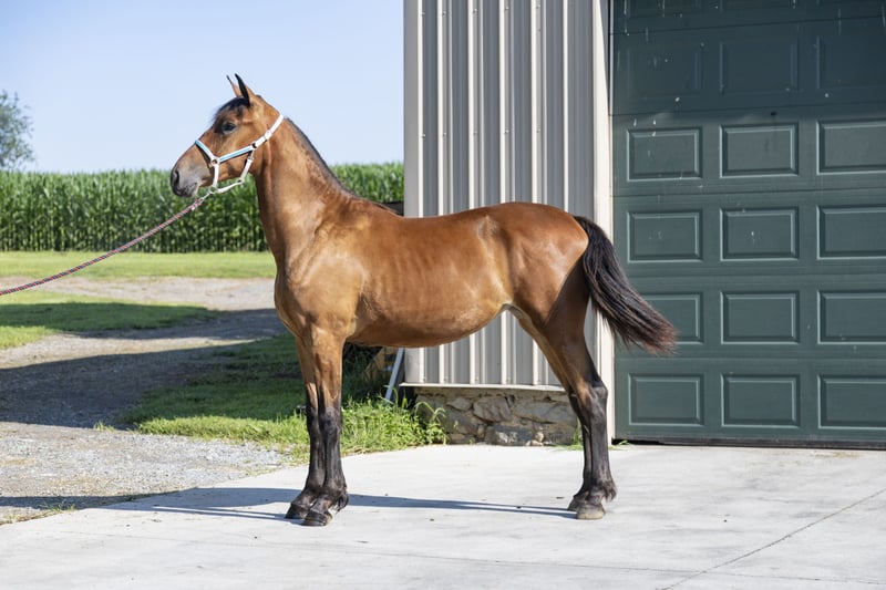 This lovely bay Friesian mare is an excellent prospect for someone looking to develop a young horse with sport horse potential. Born March 20, 2024, "Delightful" stands 15.2 hands at just over a year old and shows promise of maturing into a substantial, athletic mount. With her exceptionally calm temperament (rated 2/10), she's proving to be a sensible and easy-to-handle young mare. Sired by C-J's Cody (Friesian Sport Horse) out of MM Annie (Friesian Blood Horse), she carries quality sport horse bloodlines ideal for various disciplines. Currently halter broke and described as "sure-footed," she's ready for someone to continue her education under saddle or in harness. FSHR registered (#2024182). Located at Welsh Mountain Farm in Narvon, PA. Shipping Notes Call for shipping quote. We deliver anywhere.