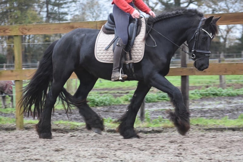 Absolut atemberaubende, äußerst ehrliche und 100 % korrekte Friese Stute Hier ist sie: Marina! (Geburtsname Maria). An ihren ehrlichen, goldglänzenden Augen erkennt man sofort, dass diese Dame einen äußerst zuverlässigen Charakter hat. Dies ist eines der wenigen Pferde, bei dem wirklich nichts zu beanstanden ist. Super ehrlich, ruhig und lieb. Sie verfügt über drei sehr korrekte, hochbeinige, aber dennoch großzügige Gänge, die sie äußerst sporttauglich machen. Sie besitzt einen aktuellen Körbericht inklusive Blutprobe, mit dem sie ohne jegliche Einschränkung für den Sport zugelassen wurde! Sie ist völlig frei von Mängeln. Derzeit ca. 1,58 m groß. Marina wurde am 5. Mai 2021 in Spanien geboren! In den Niederlanden hat sie ein Fohlen bekommen. Die Besitzer haben sich entschieden, das Fohlen zu behalten, und so darf Marina zu einer neuen, liebevollen Besitzerin ziehen. Sie ist bei ihnen für die Kutsche zugelassen, siehe Video. Wir reiten sie regelmäßig dressurmäßig und freizeitmäßig, und das klappt hervorragend – sie hat noch keinen einzigen falschen Schritt gemacht. Dies ist eine schwarze Perle. Ein echtes Unikat.