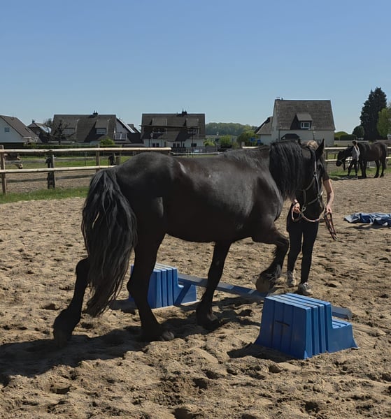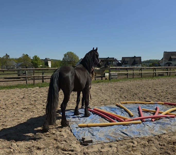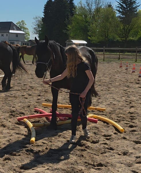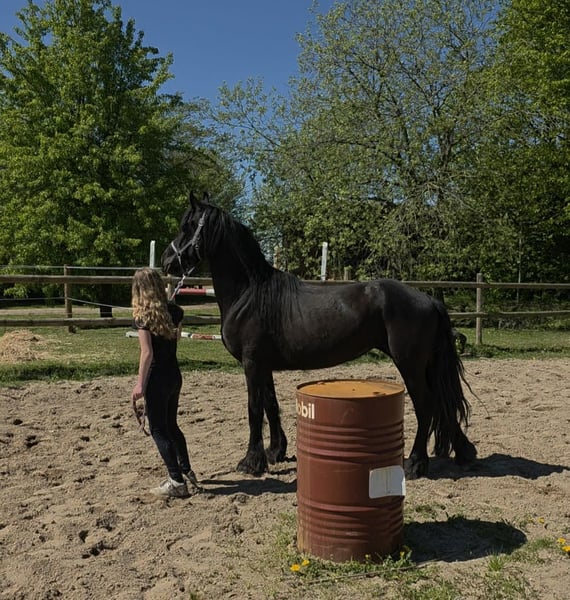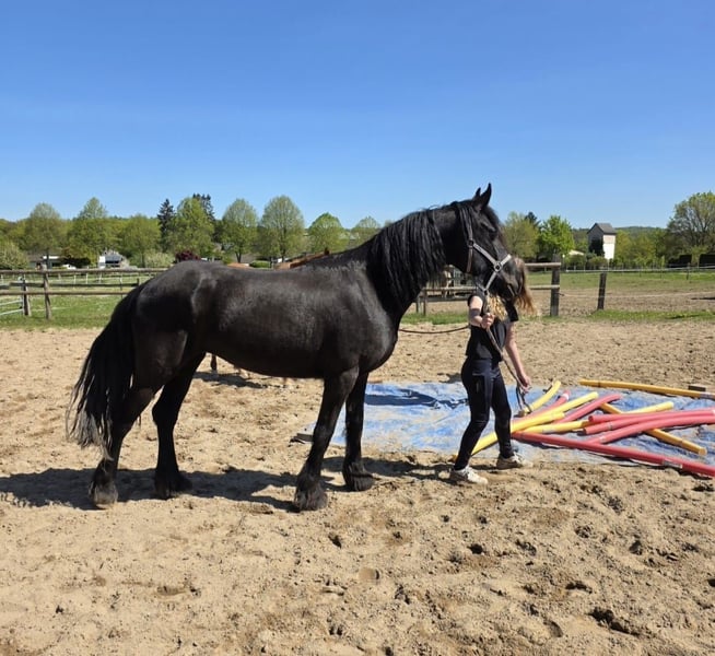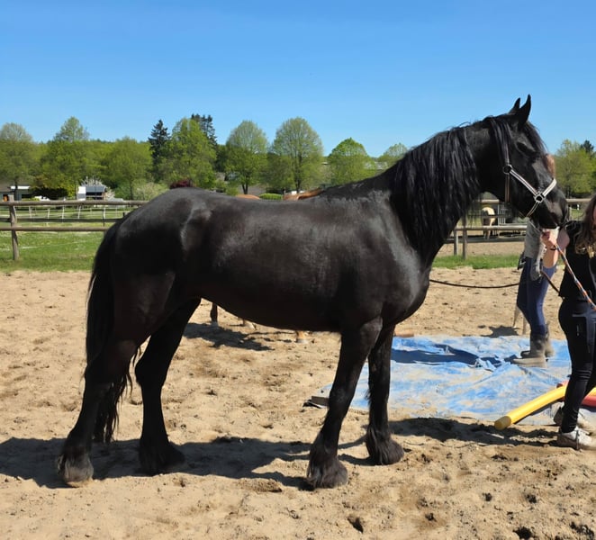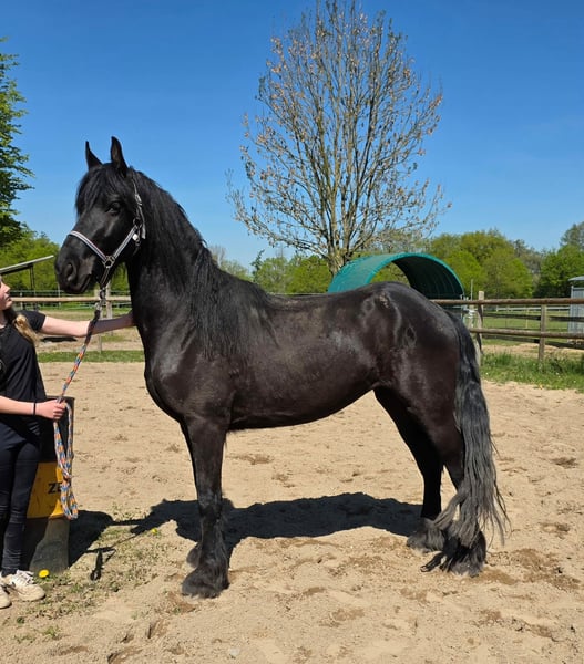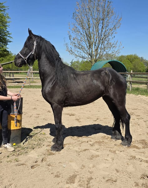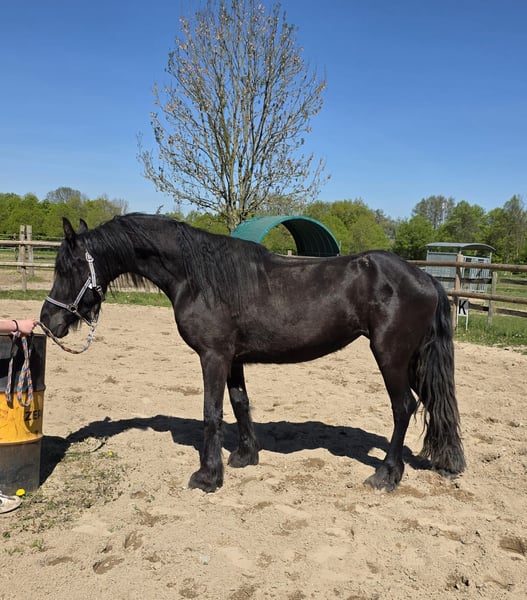 5-year-old Frisian cross mare, approximately 15.0 hh Our little Hilde is a late bloomer. She is still in full growth, which is why she has not yet been ridden. At the moment, we are gently introducing her to the basics of being a riding horse. Since she still has a lot to learn, she is currently offered at this price in a "rough" condition. Of course, her price will increase as her training progresses.