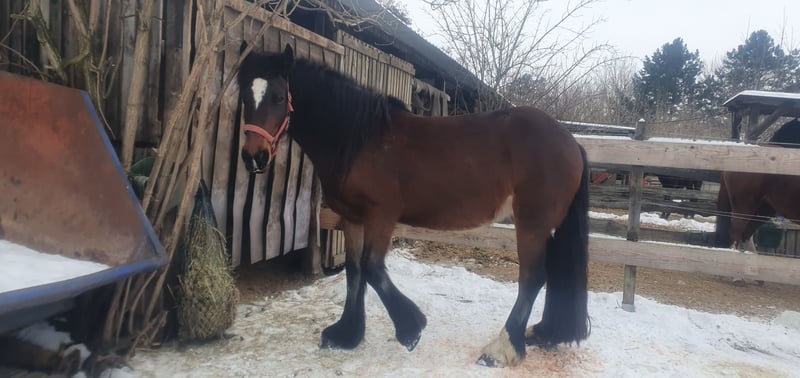 Are you looking for a resilient, strong, and robust four-legged companion with good social behavior? As a mid-sized agricultural farm, we have been breeding a hardy, athletic warmblood and a crossbreed of PRE and Hanoverian or PRE-Freizeit for over 15 years. We breed our mares exclusively via natural cover, mostly from late May onwards, and avoid interventions such as hormone treatments and ultrasound examinations. Our stallions cover the mares on the hand throughout the entire estrus cycle. The foals are born during the green season and initially stay with their mothers on pasture for the first four weeks to strengthen their bond. At night, they are housed in an open stable with paddock. Once the foals are more stable, they are gradually introduced to the larger, age-mixed herd with their grandmothers and aunts. Starting at around 7 to 8 months, we begin gentle weaning, depending on the foals' psychological readiness. Initially, the foals are separated from their mothers for only a few hours, then overnight, and rejoin the herd during the day. This process is more comfortable for both foal and mare and can take up to three weeks. The male weanlings are then moved to a separate pasture with their older siblings to get to know each other through the fence. Only when everything is relaxed and the older stallions show no negative signals are the younger ones integrated into the main herd. Over the next three to four years, the young stallions grow up in the herd, receiving hay, straw, minerals, and concentrates. They change location twice a year and have 24/7 pasture access with a stall tent. Additionally, the stallions are accustomed to traffic, as well as sheep and goats. Our horses have a strong immune system and have developed resilient tendons and ligaments through various ground conditions. They have learned to move appropriately even on challenging terrain. While we cannot guarantee that our horses will never get sick, this breeding approach has produced hardy animals that know how to behave under intense sunlight, in all weather conditions, and in the wind. We welcome any friendly contact from serious inquiries who are interested in a proper conversation. If everything fits, the price is negotiable, and installment payments are also possible. We are offering a well-raised mare that has had plenty of time to grow. She has no negative experiences and has spent her life so far on our mare trail. Friesian-Tinker cross from 2017, with passport and pedigree. Sire: Friesian Ynse W. Dam: Tinker Verona. Height: 1.60 m (approximately 15.3 hh). She has been gently backed mainly in the terrain, regularly lunged, and worked on the riding arena. She is familiar with both open stable management and 24/7 trail turnout with summer pasture. She knows electric fences, water troughs, chickens, dogs, goats, cattle, traffic, and level crossings. The mare had a foal in 2021 and 2022 with us. For serious interest, please contact us by phone.