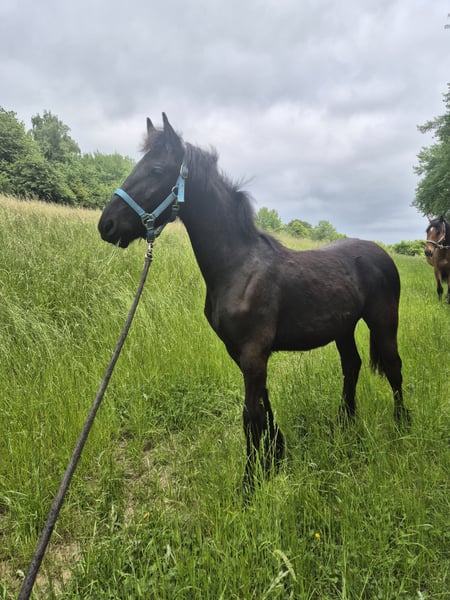 For sale is our beautiful Friesian stallion, born in 2024. Last year, he was awarded the title of Best Foal at the breeding show in Alsfeld, receiving second premium. Ari enjoys going for walks—alone or with company—and is very well-behaved, clear-minded, and a joy to watch grow up. Currently, he is still on pasture with his friends, enjoying the grazing season. He easily separates from his herd and is full of trust. His special nature makes him a reliable companion. We welcome interested parties to visit us in Hofheim and see him for themselves. Thanks to his excellent pedigree and wonderful temperament, he would also be an excellent candidate for breeding. We are only placing Aarjen in the best hands. No stabling-only inquiries, no dealers. Serious inquiries are very welcome at any time via WhatsApp.