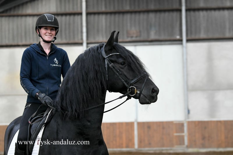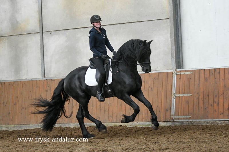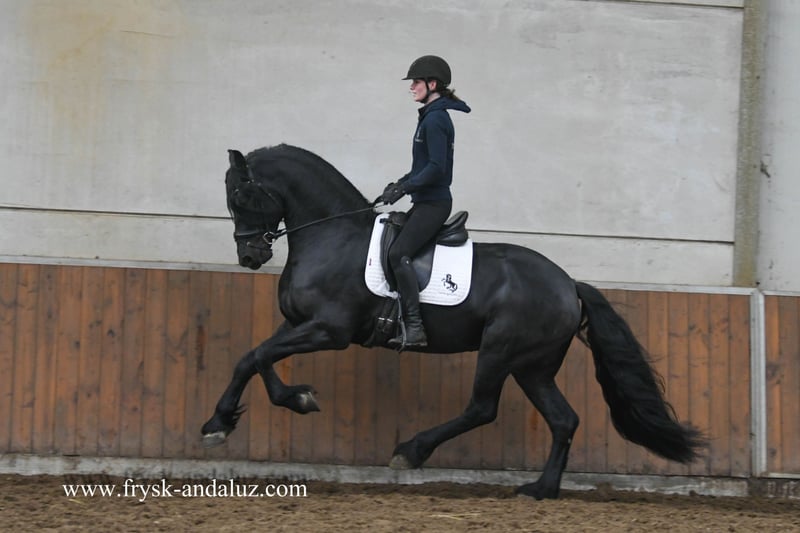 Upke Zoekt u een bloedmooi paard met super sportkwaliteiten? Een echte eye-catcher in de wedstrijding? Dan is Upke wellicht het juiste paard! Met zijn schitterende hoofd, lange volle bos manen, gitzwarte kleur, sterke bouw en top bewegingen is hij een paard die de show steelt. Upke is met recht een Ster hengst van bovengemiddelde kwaliteit die het ver heeft geschopt op de hengstenkeuring, hij liep namelijk in het Centraal Onderzoek en redde het maar net niet tot dekhengst. Upke is dus goed gereden onder het zadel, hij is een paard met een echte sportmentaliteit; heel makkelijk te rijden, denkt altijd vooruit en doet elke dag zijn uiterste best, hij is fijn gevoelig maar niet rillerig. Upke stapt met veel ruimte en tact, draaft bergop met veel ruimte en souplesse en galoppeert beter dan menig ander ras. Het is echt een heerlijk paard voor iemand die het beste van het beste wilt. In de omgang is Upke een betrouwbare en vriendelijke hengst, een paard die van aandacht houdt. Upke is dus het juiste paard voor iemand die het ver wilt schoppen in de dressuursport! https://www.frysk-andaluz.com/horse/upke-ster/ Are you looking for a strikingly beautiful horse with exceptional sporting qualities? A true eye-catcher in competition? Then Upke may be the right horse for you! With his magnificent head, long, full mane, jet-black colour, strong build and superb movements, he is a horse who steals the show. Upke is truly a Star stallion of above-average quality who has come a long way in the stallion inspection, as he competed in the Central Inspection and just missed out on becoming a stud stallion. Upke is therefore well ridden under saddle. He is a horse with a real sporting mentality; very easy to ride, always thinking ahead and doing his very best every day. He is finely sensitive but not skittish. Upke walks with great space and tact, trots uphill with great space and suppleness and canters better than many other breeds. He is truly a wonderful horse for someone who wants the best of the best. Upke is a reliable and friendly stallion, a horse who loves attention. Upke is therefore the right horse for someone who wants to reach the top in dressage!
