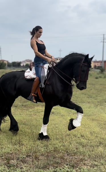 FOEKE VAN DE DEMRO STABLES (JEHANNES 484 X KYRA W.T) Stunning purebred Friesian stallion (not even aware of his breed) aged 8 years. Height: 1.72 m at the withers. A horse of unparalleled beauty and kindness. VERY HEALTHY, NEVER had any health issues. Performs perfectly on flat ground, an exceptional horse. Suitable for any rider with a minimum of experience. IMPORTANT GENETICS!! We are looking for someone who will love him passionately. For more information: +39 3917059140 (Agata) +39 3513334724 (Fabio) NO dreamers or traders, please.