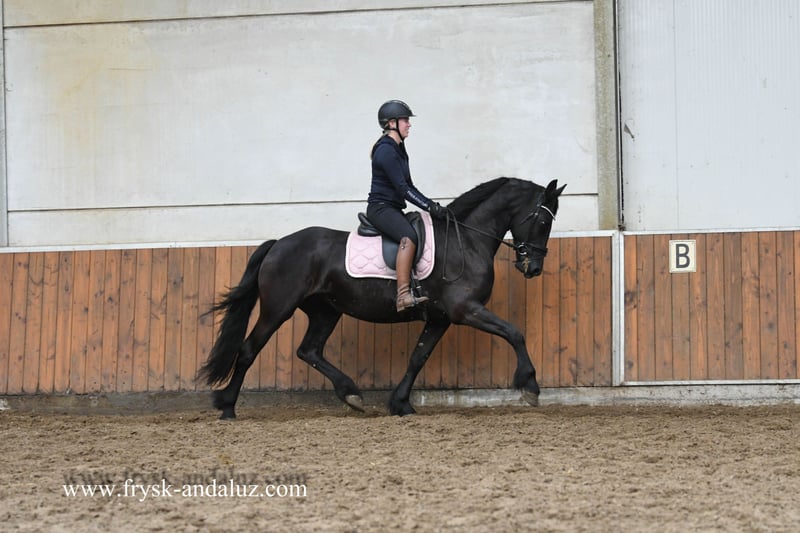 Looking for an interesting and low related star mare in foal for this year? Elouisa is a beautiful full paper Star mare. She is interestingly bred because of her low inbreeding percentage of only 0.20% and low relatedness of only 17.3%. All this is because she is a daughter of Omer 493 Sport AA x Sibald 380 x Feitse 293 Preferent! Elouisa has already given birth to 2 fillies. One by Arent 515 and the other by Boet 516, with a 2nd premium. For 2025 Elouisa is in foal to the promising stallion Kees 531 AAA (who is breeding very well so far, considering the large number of 1st premium foals). The foal to be born will have an inbreeding percentage of only 0.39% and a kinship percentage of 17.7%. The expected breeding values are as follows: Breed Type 105, Build 107, Legwork 107, Step 105, Trot 102, Gallop 102. Elouise comes from a full paper dam line: Star+2* / Star+2* / Star+Preferent+5* - also the dam of the late Folkert 353 Sport+Preferent / Star+3* / Star+2* / Model / Star - Mare lineage: 030. A great opportunity to purchase a fairly unrelated Star mare from a good dam line and in foal to the promising stallion Kees 531 AAA! Elouisa is nicely ridden and is sober and well behaved with this. Due to her hormones she is currently a bit reserved in the stable and not suitable as a cuddly horse. https://www.frysk-andaluz.com/nl/paard/elouisa-ster/