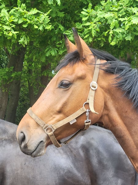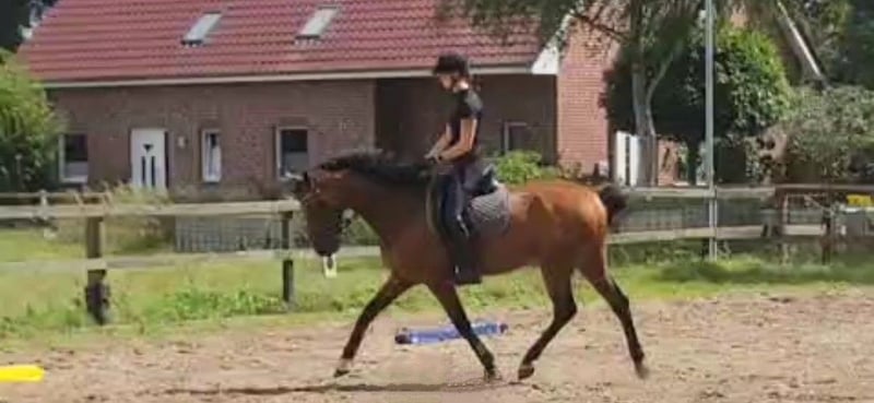 Fritz ist ein 1,67m großer brauner Wallach der noch im Wachstum steht. Er ist gut angeritten, brav und mit einem guten Go. Seine Gangarten sind alle sehr gut. Er lernt sehr schnell und ist für alles offen. Seine Grundausbildung ist im Horsemanship gestartet, weiter mit Dressur, Gelände, Freispringen und Bodenarbeit, er ist immer motiviert, nervenstark, hört gut zu, ist menschenbezogen und macht sehr viel Freude. Insgesamt sehr vielseitig unterwegs. Selbst Reiterfehler machen ihm nichts aus. Aufgrund seiner Coolness selbst für Film und Staffel interessant. Beim Züchter wurde ein Röntgentüv ohne Befund gemacht. Er ist komplett durchgeimpft, Zähne sind frisch gemacht, Hufe sind gut, geht brav auf den Anhänger. Er steht bei mir in einer Gemischten Herde. Tagsüber Wiese, Nachts Box. Bei Interesse gerne melden 0177/1443193