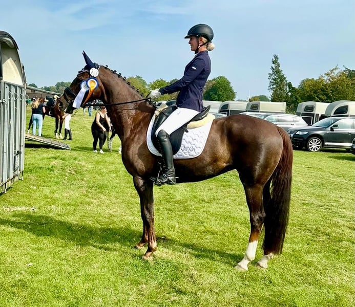 Wir müssen uns leider von unserer Stute trennen. Wir wünschen uns ein zu Hause für sie mit viel Zeit und sportlichen Ambitionen. Sie wurde solide ausgebildet und ist auf L/M Niveau. M Lektionen wie Schulterherein u Traversale im Trab u Galopp beherrscht sie sicher. Der Fliegende Galoppwechsel ist in Arbeit. Sie ist sehr lieb im Umgang und auch von Jugendlichen zu reiten, daher auch ein Umsteigerpferd. Viel Dynamik im Trab bringt sie ebenfalls als Grundvoraussetzung mit. 2015 geboren, direkt vom Züchter, kompaktes Pferd. Aus Zeitmangel daher nur in gute Hände mit Weideauslauf abzugeben. Weitere Infos per Telefon 01608404951