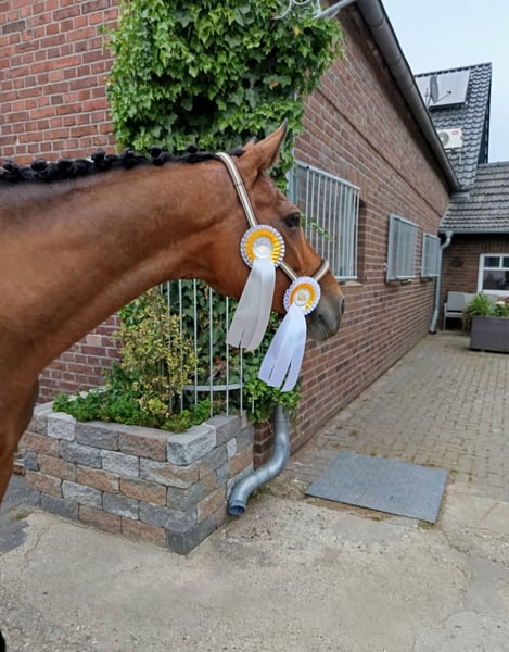Louisa ist eine vielseitig veranlagte Stute, die immer ehrlich ist, gefallen möchte und immer versucht ihren Job so gut wie möglich zu machen. Absolut lieb im Umgang. Sie liebt das Gelände und die vielseitige Arbeit. Sie war bisher als Schleifensammler in allen drei Disziplinen unterwegs. Im Springen fühlt sie sich im A Bereich wohl. In der Dressur auch im L Bereich. Da ich persönlich in der Vsk " mehr" reiten möchte, trenne ich mich schweren Herzens. Louisa ist auch als Zuchtstute geeignet. Sie hat an der Stutenleistungsprüfung mit guten Noten abgeschnitten. Ich suche für Louisa ein "für immer" Zuhause, wo sie vielleicht einem jungen Nachwuchstalent noch viel Freude bereiten kann.