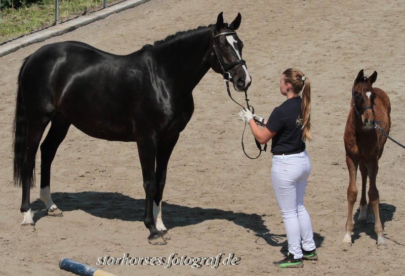 A causa di una riduzione del nostro allevamento, cerchiamo per la nostra esperta fattrice un nuovo posto amorevole. Dancina è entrata a far parte della nostra scuderia circa 10 anni fa e da allora ha dato alla luce alcuni bellissimi puledri con molta qualità di movimento. Purtroppo, una congiuntivite periodica, che non è ereditaria, ha portato a una cecità unilaterale. Ha trovato la sua vocazione come fattrice. Non ci sono segni di limitazione. Dancina è una madre estremamente premurosa, durante i suoi parti e nella crescita dei puledri non ci sono mai stati complicazioni. È tranquilla durante il trasporto e dal maniscalco e si comporta sempre bene nel maneggiarla. Attualmente è gravida di Be My Dancer. Tuttavia, a causa della prossima nascita, il trasferimento potrà avvenire solo dopo lo svezzamento del puledro. Un acquisto incluso il puledro sarebbe possibile dopo un dettagliato accordo. Possiamo immaginare Dancina anche come cavallo da compagnia e per la famiglia. Ama l'attenzione e le coccole e sviluppa una forte fedeltà verso la sua persona di riferimento, non appena ha preso fiducia. Nella mandria è molto compatibile. Attualmente vive durante il giorno con circa 10 altre fattrici e di notte sta in box. Alcuni dei suoi puledri sono ancora nella struttura e possono essere visionati su richiesta. ------------------------------- Tutti i nostri cavalli in vendita sono regolarmente vaccinati e sverminati. Anche un trattamento dentale di routine annuale è parte dei nostri standard. Per ulteriori dettagli e domande sui cavalli in vendita, vi preghiamo di contattarci telefonicamente dal lunedì al venerdì dalle 9 alle 18. I messaggi tramite ehorse verranno risposti solo in parte.
