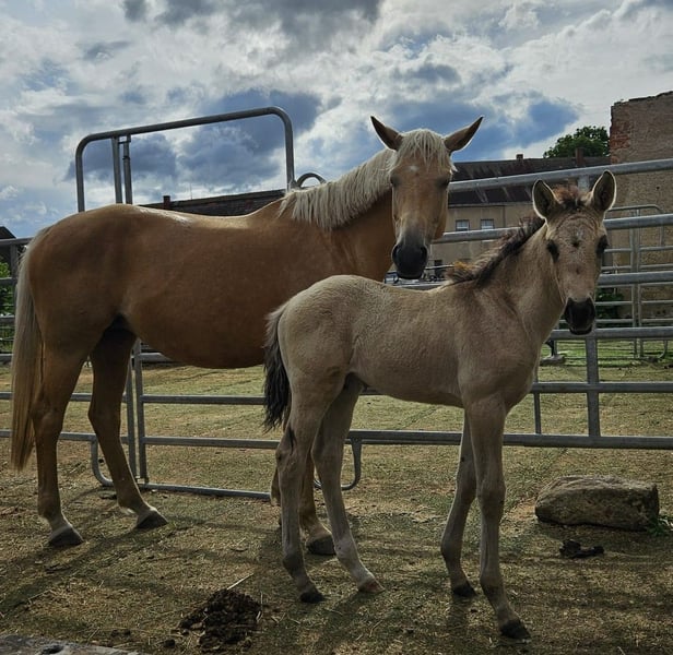 This powerful mare not only impresses with her calm and people-oriented character but also with her genetics. She carries two dilution genes, namely the cream gene and the dun gene, making her a true buckskin with a dorsal stripe on her back and zebra stripes on her legs (known as Dunskin, which combines buckskin and palomino). Additionally, she boasts a flawless and extremely correct conformation, standing on strong, healthy legs. She owes this to her parents, as her father is none other than the Lusitano stallion Inefavel, who competes at Grand Prix level. He has recently been recognized by the Oldenburg Verband and captivates not only with his unique appearance but also brings the necessary toughness and robustness that have become less prominent in modern sport horse breeding, all while maintaining excellent movement potential. His offspring are known for their quality and charisma, so it is no surprise that this little ballerina received an above-average rating from the association and can be called a premium foal. On the maternal side, a clear-headed versatile Czech line meets the highly sought-after blood of the influential stallion Quarterback. The resulting dam of this little mover teaches her foal how relaxed interactions with the environment and people can be, making the learning period for the basics a breeze. She is familiar with everything one needs to know, meaning leading, grooming, tying, and picking up hooves are no problem. Since we only raise two large foals a year, she has also experienced plenty of family connection in her young life. Her birth and upbringing have been absolutely complication-free, and she has had the opportunity to grow up with plenty of movement on various surfaces. Specifically, she spent the first three days with her mother in a 4x6m outdoor box and then enjoyed 24-hour access to the paddock with another mare and her foal. This also means that, despite having shelter, she has experienced all kinds of weather. Trade or part-exchange for a pregnant broodmare (black or special color) is possible.