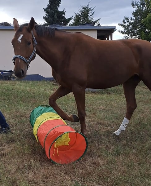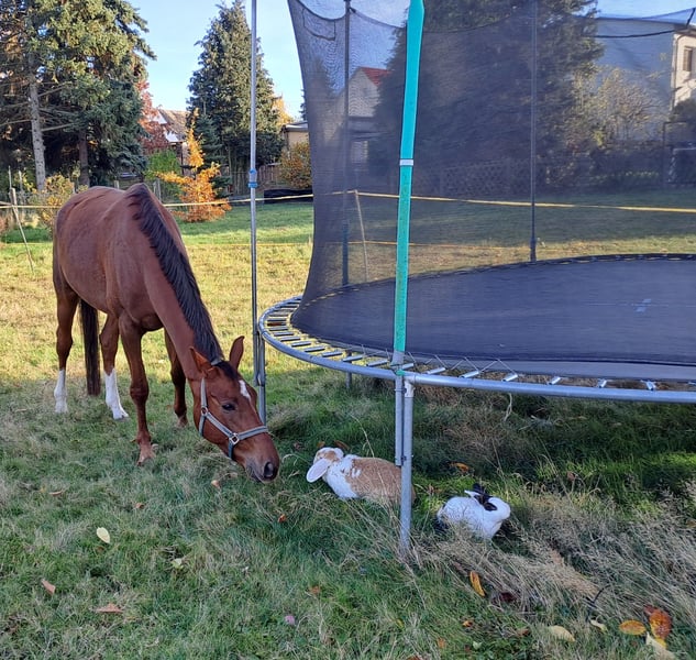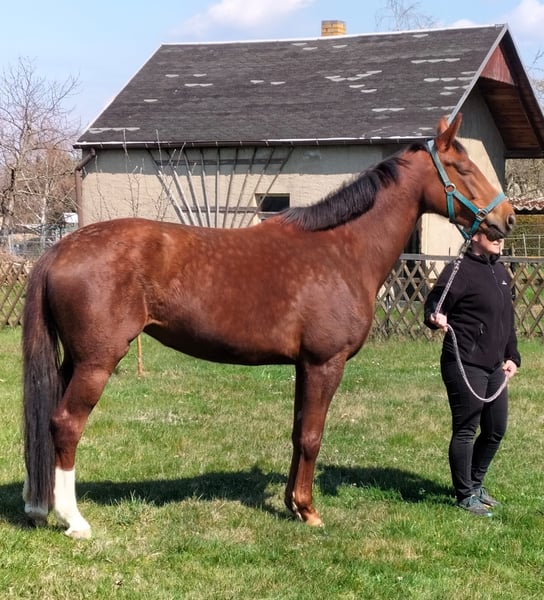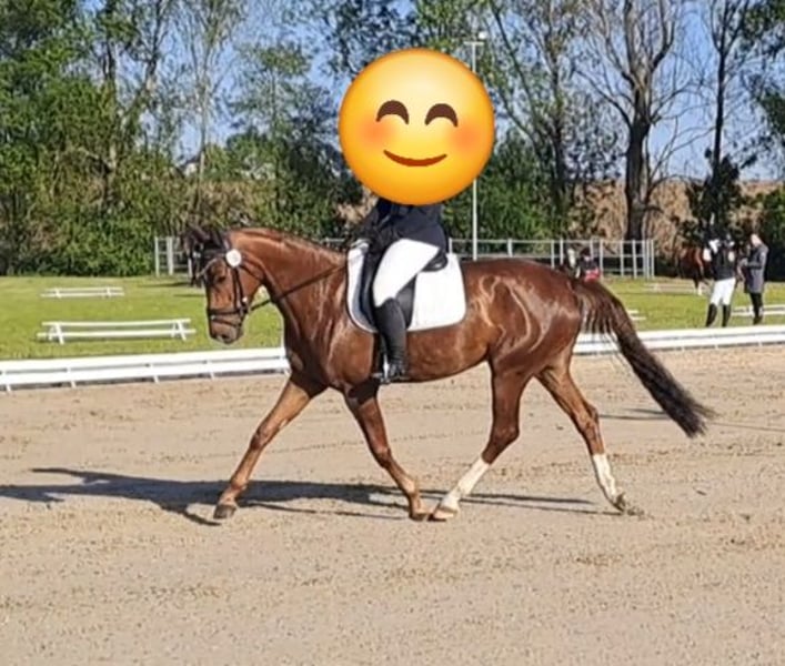 For sale is a 6-year-old mare (height at 16.1 hh) who impresses with her friendly and uncomplicated nature in daily handling. She is very personable, well-behaved during handling, and confident in loading. She also handles being alone for short periods, such as while grazing, without any issues. By Don Royal (sire) out of a Quarterback (dam), she carries excellent dressage-oriented genetics. She is registered in the stud book and has received consistently good evaluations, with scores of 7.5 to 8 in movement and conformation. Training-wise, she is at a solid L-level and has already been successfully presented in dressage horse tests at class L competitions. Under saddle, she is motivated, eager to perform, and shows great potential for further development. However, she should be ridden by an experienced rider, as she can sometimes react sensitively and respond quickly. She is always honest and does not buck, but she requires a confident and calm rider. Currently, she is not suitable as a children's riding horse and has not been fully tested in traffic, as she can be startled by fast-moving cars. An excellent mare for an ambitious rider seeking a talented young horse with good pedigree and promising prospects.