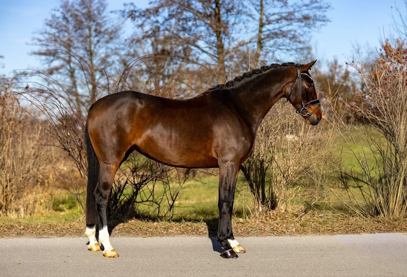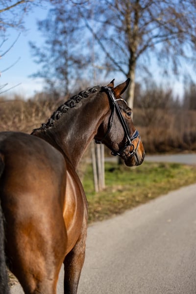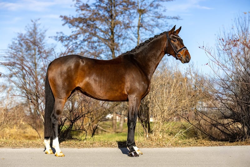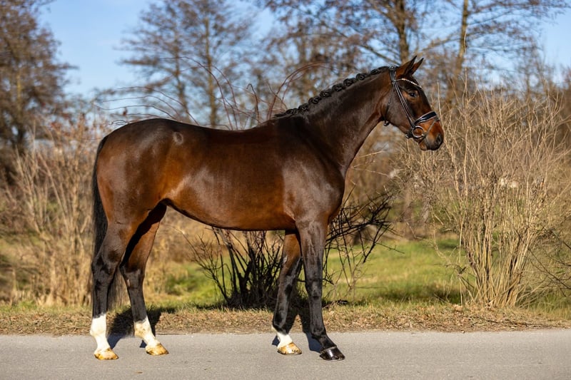 This exceptionally beautiful brown mare impresses with outstanding quality, rideability, and a remarkably clear mind. A horse for riders with high standards, yet one that delights with its honesty and straightforwardness. Her trot is particularly noteworthy—powerful, controlled, and well-engaged through the body. The canter demonstrates great expression, strength, and freedom from the shoulder. The walk is clear and steady in rhythm. Overall, she possesses three very good basic gaits, providing a solid foundation for a reliable and promising dressage education. Under saddle, she is very easy to work with, light in the contact, attentive, and always stays focused on her rider. She remains clear-headed, shows no overreactions, and consistently conveys a sense of security. This combination of quality and reliability makes her appealing not only to less experienced riders but also to well-trained young riders seeking a high-quality young horse. In handling, the mare is absolutely well-behaved, friendly, and trusting. She is personable, affectionate, and uncomplicated in daily handling—simply a horse that one enjoys having around. Her pedigree further underscores her high caliber: she is a direct descendant of Quarterback, with maternal lines tracing back to Sandro Hit and Fidermark. These bloodlines are renowned for rideability, expression, and willingness to perform, having produced numerous successful dressage horses. A very special mare with exceptional quality, versatile in use, suitable for demanding riders as well as ambitious young riders. She is positioned in the upper price segment. Location: Rosenheim