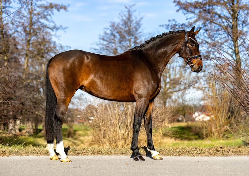 Deze bijzonder mooie bruine merrie overtuigt door haar hoge kwaliteit, rijvaardigheid en een opmerkelijk heldere geest. Een paard voor veeleisende ruiters dat toch enthousiasmeert door haar eerlijkheid en ongecompliceerde karakter. Wat vooral opvalt, is haar zeer goede galop, krachtig, gereguleerd en goed springend door het lichaam. De draf toont veel expressie en schoudervrijheid, de stap is duidelijk en ritmisch. In totaal beschikt ze over drie zeer goede basisgangen, die een degelijke en perspectiefrijke dressuurmatige opleiding mogelijk maken. Onder het zadel laat ze zich zeer goed werken, is licht aan de hand, alert en altijd bij haar ruiter. Ze blijft helder van geest, vertoont geen overreakties en geeft altijd een veilig gevoel. Juist deze combinatie van kwaliteit en betrouwbaarheid maakt haar ook interessant voor minder ervaren ruiters of goed rijdende jongeren die op zoek zijn naar een hoogwaardig jong paard. In de omgang is de merrie absoluut braaf, vriendelijk en vertrouwelijk. Ze is mensgericht, knuffelig en in het dagelijkse handling eenvoudig in de omgang – een paard dat je gewoon graag om je heen hebt. Haar afstamming onderstreept eveneens haar hoge kwaliteit: Ze is een directe nakomeling van Quarterback, via moederszijde terug te voeren op Sandro Hit en Fidermark. Deze lijnen staan voor rijvaardigheid, expressie en bereidheid tot presteren en hebben talloze succesvolle dressuurpaarden voortgebracht. Een zeer bijzonder paard met veel kwaliteit, veelzijdig inzetbaar, voor veeleisende ruiters evenals voor ambitieuze jonge ruiters. Ze bevindt zich in het hogere prijsegment. Locatie: Rosenheim