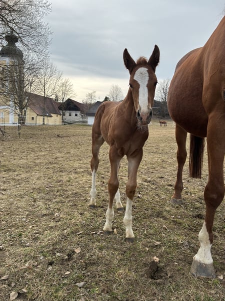 Unsere Bijou sucht ihren Menschen! Unser hübsches Fuchsmädchen zieht jeden Blick auf sich, mit ihren 4 weißen Beinen und der großen Blesse. Sie ist mit einem guten, kräftigen und vor allem korrekten Fundament ausgestattet. Sie taut jeden Tag mehr auf und freut sich über Streicheleinheiten. Bijou wird bestimmt eine tolle Partnerin fürs Springen, aber auch für den Freizeitbereich. Sie hat gute Grundgangarten und ist mit guter Energie ausgestattet, aber besonders hervorzuheben ist der tolle bergauf gesprungene Galopp - hier sitzt der Motor, wo er hingehört. Geschätztes Endmaß +- 1,68m Bei der Abgabe im Herbst 2026 kennt sie das Fohlen ABC, stand schon mehrmals am Hänger, kennt große Maschinen, Kinder, Rinder, Hunde usw. Unsere Pferde kennen verschiedene Haltungsformen und die Fohlen wachsen artgerecht in der Gruppe mit Gleichaltrigen auf. Wir freuen uns darauf, diesen besonderen Nachwuchs aus unserer privaten kleinen Eigenzucht persönlich vorzustellen. Vater ist der 5 Jährige AWÖ Hengst Empire Kalone. Der im perfekten Hengsttyp mit viel Kraft im Rücken stehende Empire Kalone verfügt über 3 hervorragende Grundgangarten. Sein Sprungablauf ist gekennzeichnet von Vermögen, schnellen Reflexen, Bascule und einem explosionsartigen Abdruck im Hinterbein. Empire Kalone gewann seine Veranlagungsprüfung mit Traumnoten. Für die Springanlage, den Gesamteindruck und die Rittigkeit erhielt er 9,0 - vom Fremdreiter dafür sogar die Höchstnote 10! Altersgemäß vorgestellt, konnte er in seiner ersten Turniersaison gleich voll überzeugen und holte sich 22 Platzierungen, darunter 4 Siege. Sein Vater Ermitage Kalone war bei den Weltmeisterschaften der jungen Springpferde DAS Gesprächsthema. Der 12-jährige Hengst von Catoki x Kannan x Veloce de Favi glänzte mit beeindruckenden Runden bei den Belgischen Meisterschaften sowie bei der EM und den Olympischen Spielen. Platzierungen und Siege in Großen Preisen bis 1,65 kann der Hengst auf sein Konto verbuchen. Die Mutter Topia van de Padenborre war selbst im Springsport erfolgreich. Nach ihrer Sportkarriere brachte sie in ihrer züchterischen Laufbahn bereits vier internationale Spitzenpferde u.a. Amazone (1,60), Entre Nous (1,60), Janice (1,50) und Dacapo (1,40). Ihre Mama Bilitis de Vesram lief selbst vor einigen Jahren noch erfolgreich im Springsport. Sie war in der Klasse A siegreich und wurde bis zur Klasse L im Parcour vorgestellt.. Selten habe ich so eine Stute erlebt, die sich durch nichts erschüttern lässt, sie ist im Umgang total brav und unkompliziert und ruhig, lässt sich gut reiten und ist fein an den Hilfen, ich bin mir sicher das hat sie an Bijou weitergegeben.