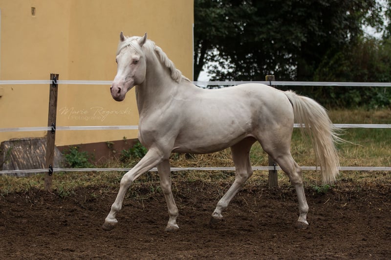 Warmblood stallion | Cremello | born 2009 | approx. 162 cm Approved by ECHA-ESV, approved for EASP Genetics: e/e A/A Cr/Cr Tested: ECVM without findings | SCID, CA, WFFS, PSSM2 negative Don Cream GF is a compact, correctly built Cremello stallion with a friendly nature and clear type characteristics. He passes on an expressive head, stable limbs and harmonious movements. In England, his offspring are successfully used in dressage and colour breeding. He lives year-round in an open stable with direct visual contact to the herd of mares and is friendly, calm and people-oriented. He is also reliably sociable with pregnant mares in large areas. Due to his genetic makeup, he is particularly suitable for colour breeding programmes, even when paired with double-lightened mares.