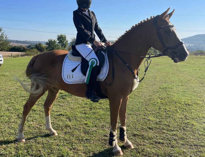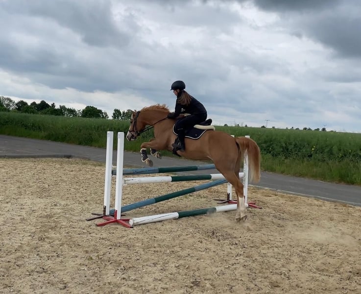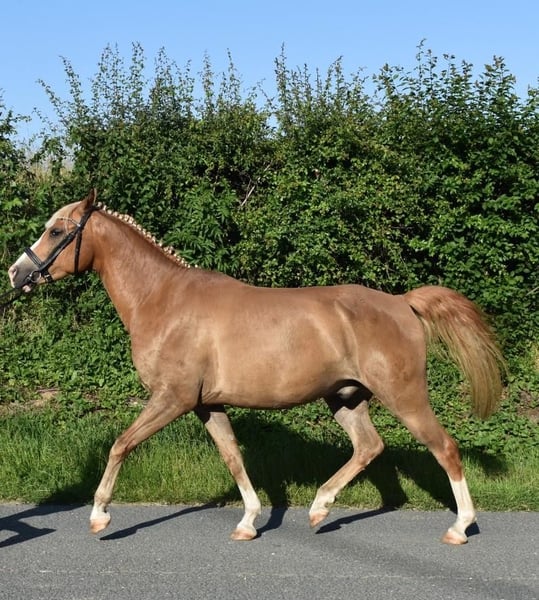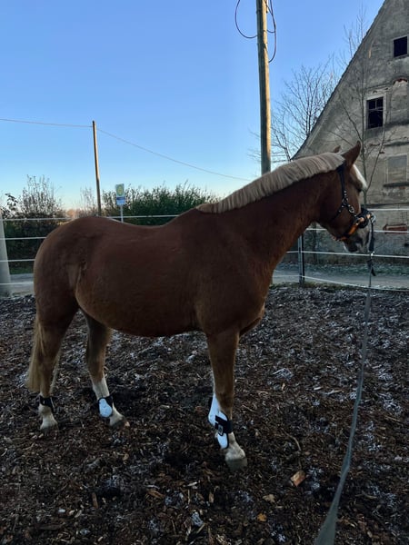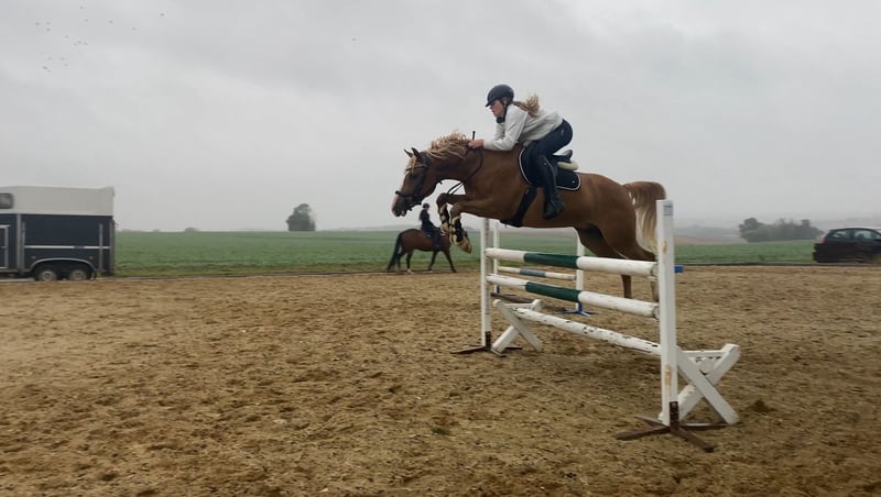 Our gelding was gently backed at the age of four and has since become very dear to us. He is a clever pony that learns quickly and particularly enjoys jumping, where he clearly finds his element. He has never been ill, has no allergies or similar issues, and is barefoot (excellent hoof quality).