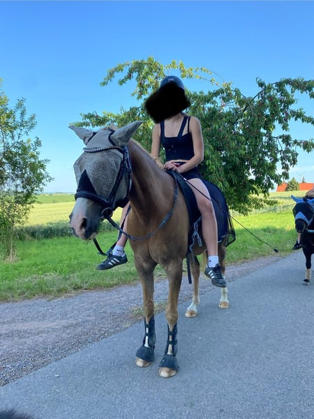 Besides me, he is occasionally ridden by an experienced 14-year-old rider who can easily follow the exercises I have worked out with him. My 8-year-old daughter, a beginner rider, also takes him for a few rounds in the arena. However, it is clear that a young child cannot handle him alone for long, as they lack the experience and influence to perform and develop his potential.