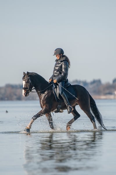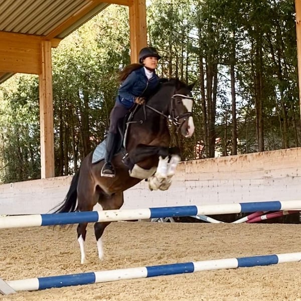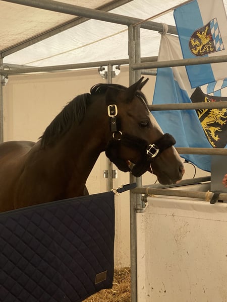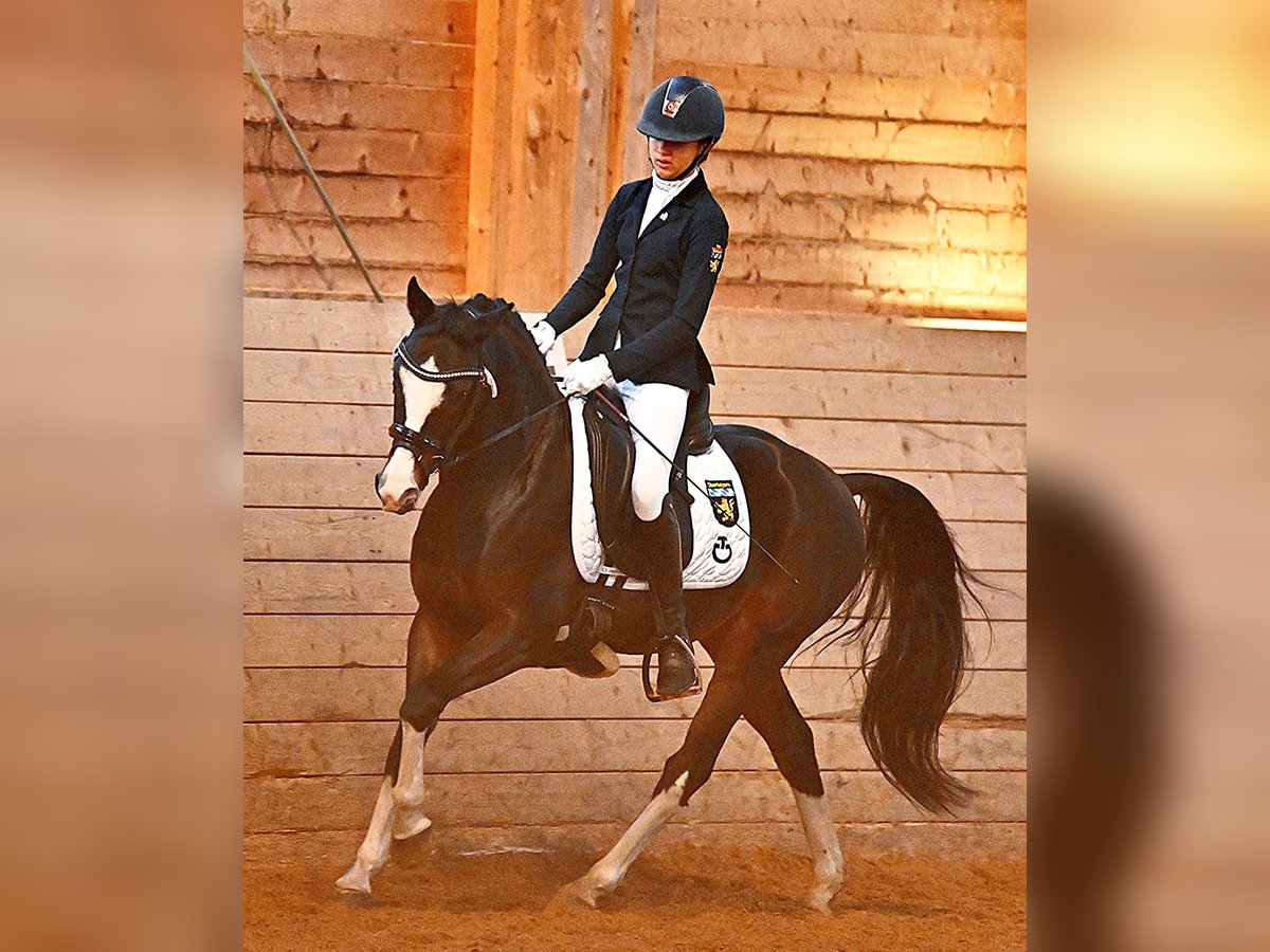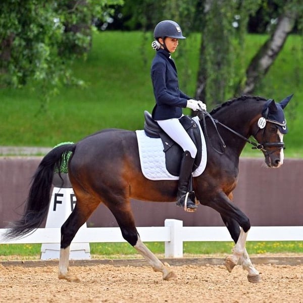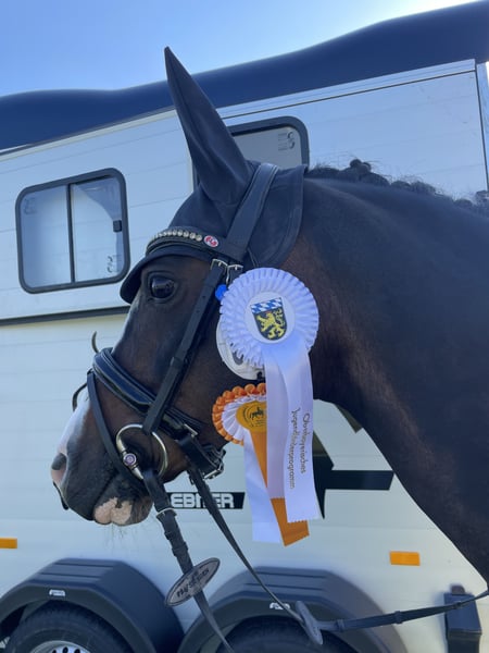 Schweren Herzens verkaufen wir unseren wunderschönen Reitponywallach da unsere Tochter aus ihm rausgewachsen ist. Unser Pony ist ein ehemalig gekörter Hengst und Sieger der Hengstleistungsprüfung in Münster-Handorf. Er ist unglaublich lieb und brav im Umgang, Egal ob am Stall, beim Schmied/ Tierarzt, beim Verladen, auf dem Hänger oder beim Scheren ist er jederzeit alleine von meiner Tochter zu händeln. Auch auf dem Turnier ist er nicht guckig. Er kennt festlich dekorierte Hallen und Übernachtungsturniere und war immer unkompliziert. Im Gelände ist er brav, sowohl alleine als auch in der Gruppe. Meine Tochter hat 11 jährig mit ihm den Einstieg in die A-Dressur geschafft und nach vielen Schleifen z.T. mit 8er Noten ist sie mit ihm in den Regionalkader berufen worden, 12 jährig war sie mit ihm bis L siegreich. Er beherrscht alle L-Lektionen sowie Traversale und fliegende Wechsel. Im Springen haben wir ihn nicht weiter gefördert, haben aber in den letzten Wochen im Training festgestellt, dass er hier ein großes Talent hat. Mit viel Motivation, Zug zum Sprung, hervorragender Manier und dabei immer wieder gut aufzunehmen springt er ohne Probleme einen Parcours mit 1/1,10 mit Luft nach oben. Daher können wir ihn uns auch sehr gut im Springsport vorstellen. Da er sehr mutig ist und Wasser liebt ist er sicher auch für die Vielseitigkeit interessant Es liegen klinisch Befundfreie AKU Ergebnisse sowie Röntgenaufnahmen von Beinen und Rücken aus dem Jahr 2023 vor. Bei Interesse oder für weitere Informationen kontaktieren Sie mich gerne.