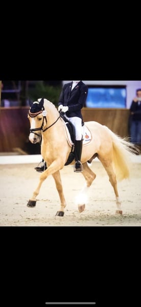 For sale: German FEI dressage pony – gelding, born in 2011, Palomino We are offering a beautiful German dressage pony gelding, born in 2011. The pony impresses with its elegant appearance and friendly nature. Standing at 14.5 hands, he is perfect for ambitious riders seeking a reliable and versatile partner. He is trained in dressage and demonstrates considerable talent along with a pleasant basic gait. The pony is healthy, regularly vaccinated, and ridden pain-free. He has a calm and friendly demeanor, is well-handled, and can be comfortably ridden by both experienced and less experienced riders. Unfortunately, the owner has outgrown pony riding, which is why he is only available to the best of hands. Ideal for riders looking for a dependable dressage pony to achieve success together or to continue his training. Please feel free to contact me for further information or if you are interested. Viewings are possible by appointment.