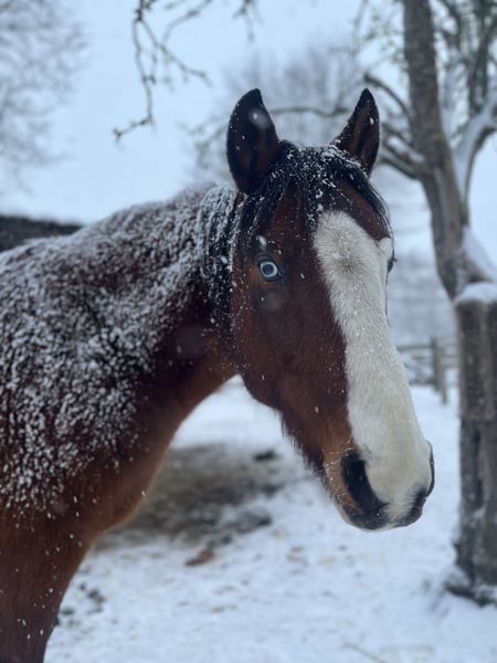 Aktuell steht er bei uns in gemischter Herde im Offenstall mit 24/7 Zugang zur Koppel.