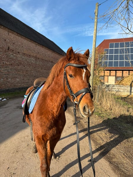 Born in 2022, approximately 1.42 m tall Barefoot Good farrier and loading behavior Gelding German Reitpony Million Reasons X Merlin This beautiful chestnut pony is for sale. After only a few weeks under saddle, he already shows great reliability both in the terrain and in the riding arena. He demonstrates significant potential as a show jumper when free jumping. With further training, he could become an excellent children's pony. Currently suitable for confident young riders or children with support from riding instructors or parents. He is a young horse at the beginning of his training. To prevent riding tourism, we reserve the right to charge €30 for a pre-ride and trial.