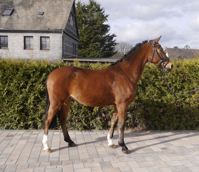 Der fünfjährige Karolus (*2021) ist ein qualitätsvolles Nachwuchspony mit bester Genetik. Die Abstammung Komplett / A New Star verrät bereits, das hier kein geringerer zum Verkauf steht als ein älterer Vollbruder des Westfälischen Siegerhengstes Komet. Die Mutter Staatsprämienstute Allegra war zweite Reservesiegerin der Westfälischen Eliteschau in Münster-Handorf. Karolus besticht durch seinen Bezug zum Menschen und durch seine Feinfühligkeit, wobei er seinem Reiter immer gefallen möchte. Er lässt sich mit feinen Hilfen reiten, wobei besonders ein sehr guter Schritt, sowie der bergauf gesprungene und ausbalancierte Galopp hervorzuheben sind. In Dressurpferdeprüfungen der Klasse A war er bereits mehrfach platziert. Karolus ist ideal für einen einfühlsamen Reiter mit Erfahrung in der Ausbildung junger Pferde. Karolus ist ein tolles Nachwuchspony für einen ambitionierten Reiter mit Herz, Gefühl und Jungpferdeerfahrung. Preiskategorie: >25.000 €