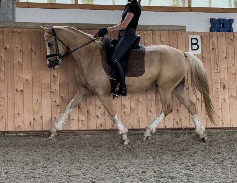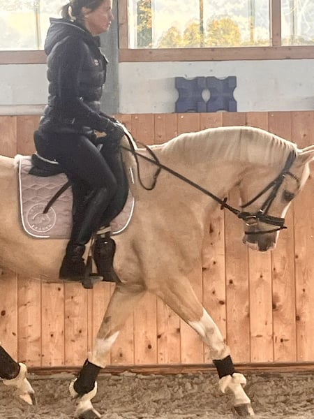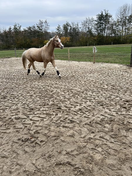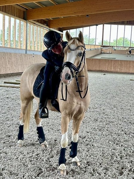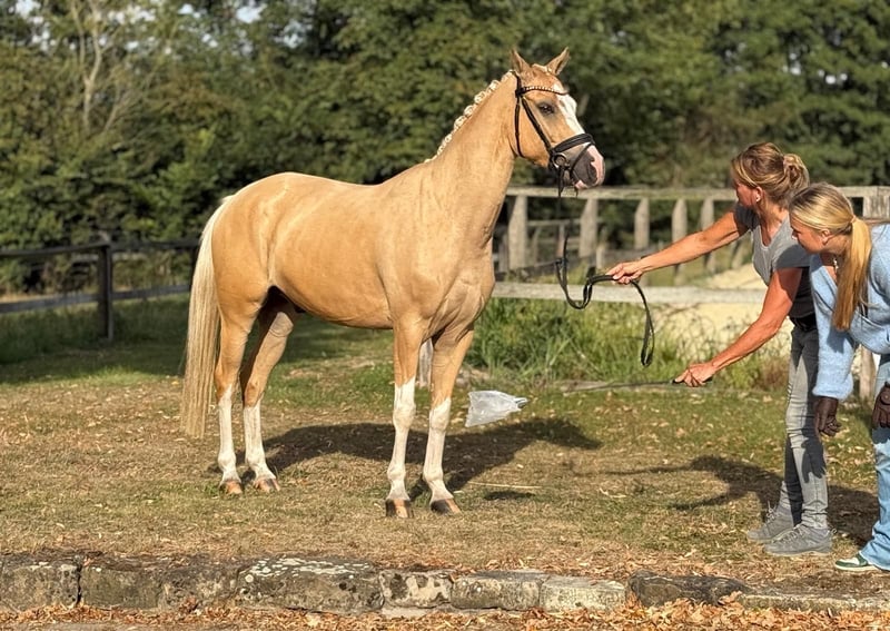For Sale: German Riding Pony Gelding – Born in 2020, Palomino We are offering a stunning German Riding Pony gelding, born in 2020. With his elegant Palomino coat and a height of 147 cm, he is a real eye-catcher. The pony is ideally suited for dressage and shows great potential for the next levels. He is friendly and well-behaved, eager to learn, and already demonstrates initial dressage movements. Perfect for ambitious riders seeking a reliable and attractive pony. Unfortunately, due to personal reasons, I am no longer able to give him the attention he deserves. It is incredibly difficult for me to part with him, but I believe it is in his best interest. Priority goes to the well-being of the pony over the price. Please feel free to contact me for more information or if you are interested.