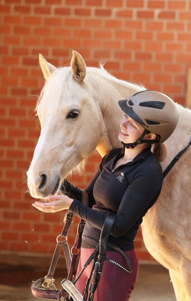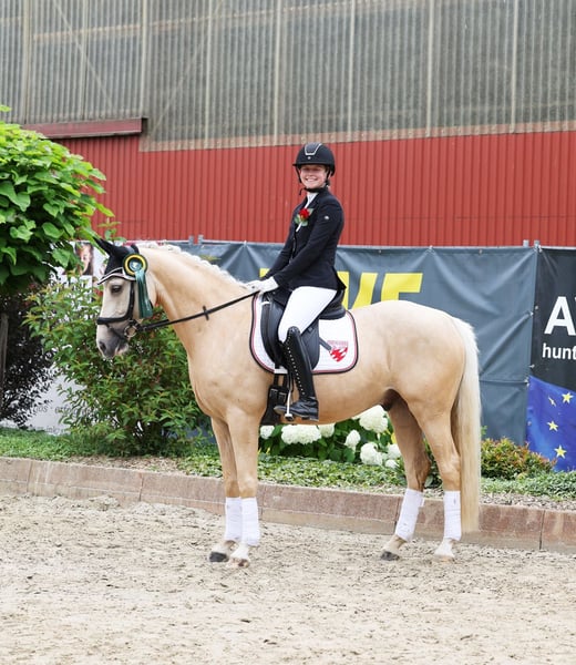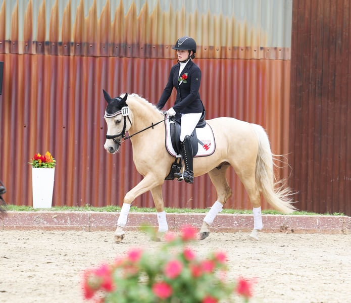 Djulyo wurde aufgrund seiner Größe erst spät angeritten und erst im letzten halben Jahr intensiver gefördert. Gerade hat er seinen ersten Turnierstart gemeistert und direkt eine Schleife mitgebracht. Er kennt sogar schon Mannschaftsreiten und liebt auch Anhänger fahren. Ideales Pony für kleine Erwachsene oder erfahrene Jugendliche mit feiner Hand. Er befindet sich jetzt auf sicherem A- Niveau hat aber wenig Lust zum Reiten. Am liebsten wird er nur 2 bis 3 mal die Woche geritten und am allerliebsten macht er Bodenarbeit oder Kunststücke. Er ist sehr intelligent, lernt schnell und möchte immer was neues machen. Nichts für Langweiler, sondern für jemanden, der eine Herausforderung sucht. Nur einmal Probereiten bringt bei ihm gar nichts, denn Leute die er nicht kennt, mag er erstmal nicht... man muss also öfter kommen und am besten sich auch mit ihm beschäftigen und nicht nur rauf und wieder runter. Er sucht sich seinen Reiter aus... Mit Dreieckszügeln ist er auch mit Kind im Unterricht schon gelaufen aber regelmäßig sollte er von einem erfahrenen Reiter weiter ausgebildet werden. Mit Springen sind wir jetzt gerade erst angefangen aber das macht er auch sehr gut. TÜV ohne Befund als er 3 war gemacht