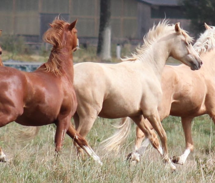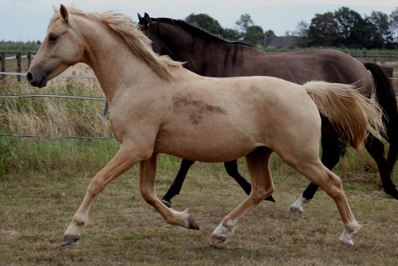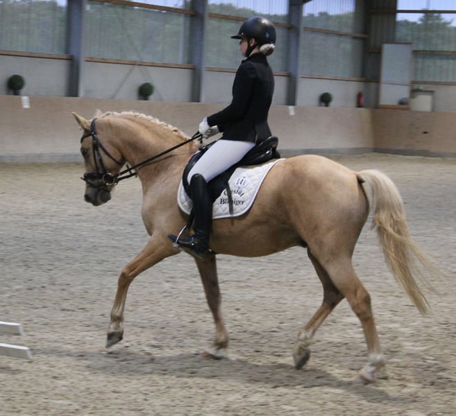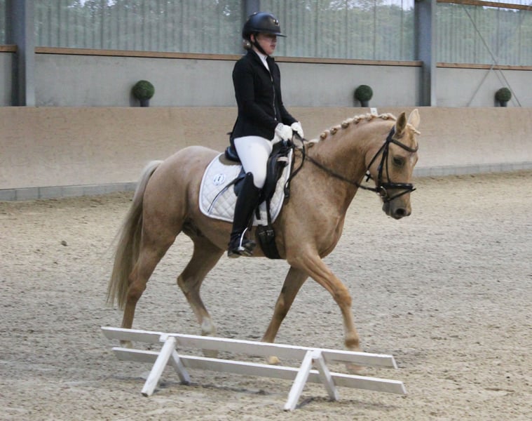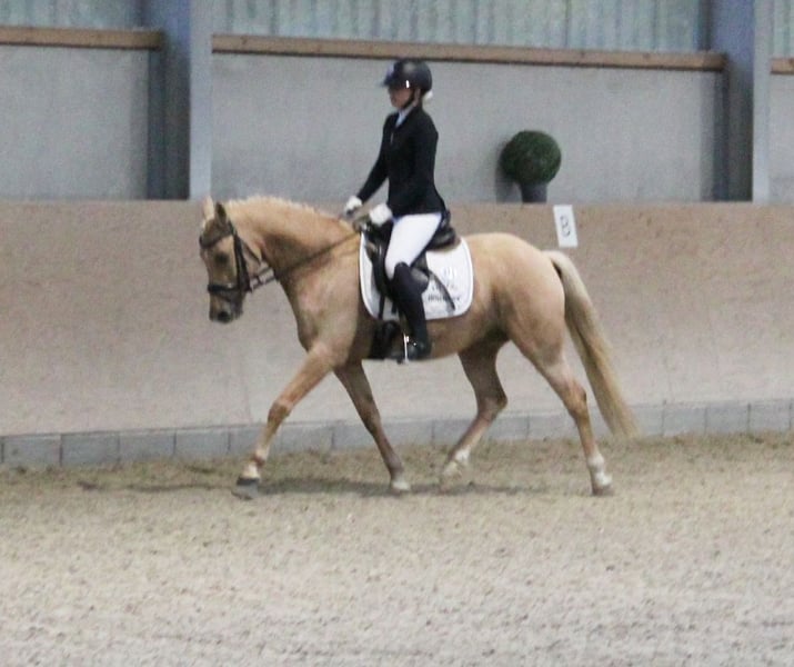 **Sale ad: Charming German Riding Pony gelding** For sale is a beautiful German Riding Pony gelding, born in 2018. This charming palomino not only impresses with his eye-catching color, but also with his pleasant temperament and excellent dressage qualities. With a height of 145 cm, he is ideal for ambitious riders looking for a reliable and talented partner for dressage. He is always motivated and willing to learn, which makes him the perfect companion for both competition and everyday training. Interested parties are cordially invited to meet this exceptional gelding in person. For further information and to arrange a viewing appointment, please do not hesitate to contact us. [Your contact details]