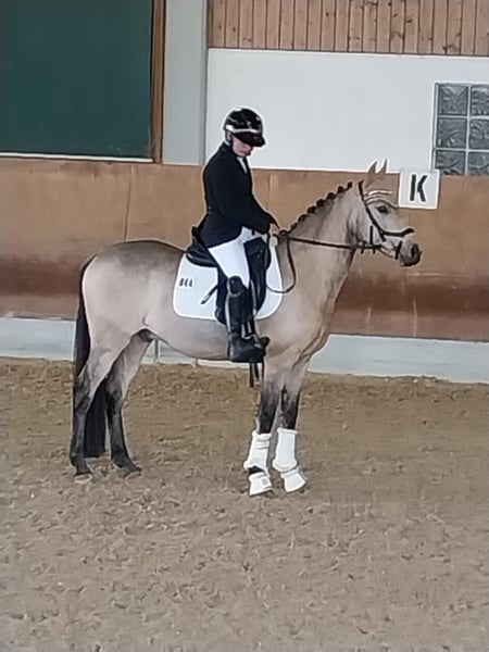 Zum Verkauft steht hier ein bildschöner Reitpony Wallch im perfekten Ponymaß mit Top Abstammung. Er war 3 jährig gekörter Hengst. Ab 4 jährig erste Turnierprüfungen, Siege und Platzierungen in Reitpony / pferde Prüfungen und Dressurpferde A mit Noten bis 8,0. 5 jährig bayerischer Dressurpony Champion, 5 und 6 jährig Qualifiziert fürs Bundeschampionat. 6-7 jährig Siege und Platzierungen bis Dressurprüfungen der Klasse L. 5 jährig mit jugendlicher Reiterin A platziert. 4-7 jährig 35 Starts und davon 28 Siege und Platzierungen. Nebenbei 4-7 jährig mit Kind in Führzügelwettbewerben hoch erfolgreich. Er ist ideal für ambitionierte, gut betreute Junioren geeignet. Das Pony wird nur in nachweislich Artgerechte Haltung verkauft. . Zum Schutz des Ponys werden fürs Probereiten 40 Euro veranschlagt, die beim Kauf verrechnet werden.