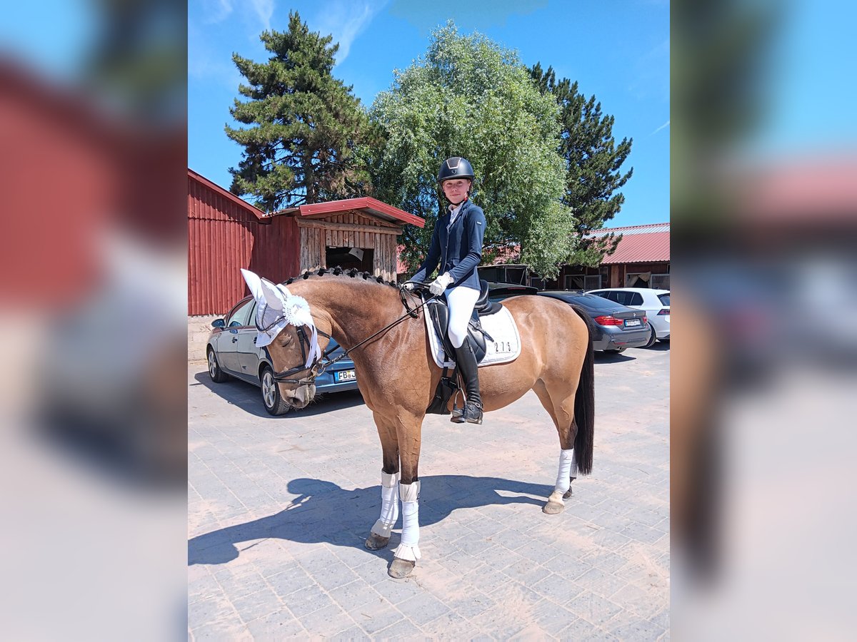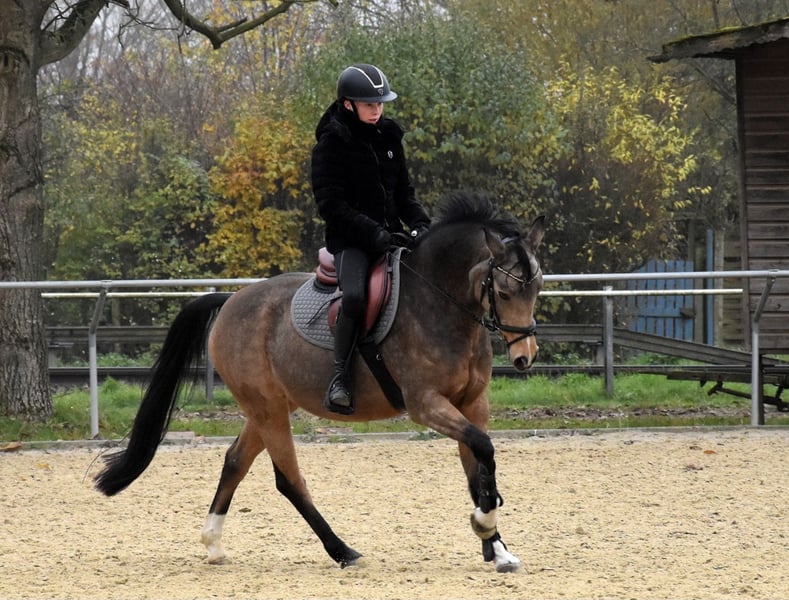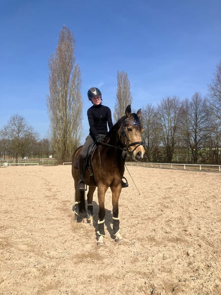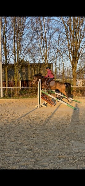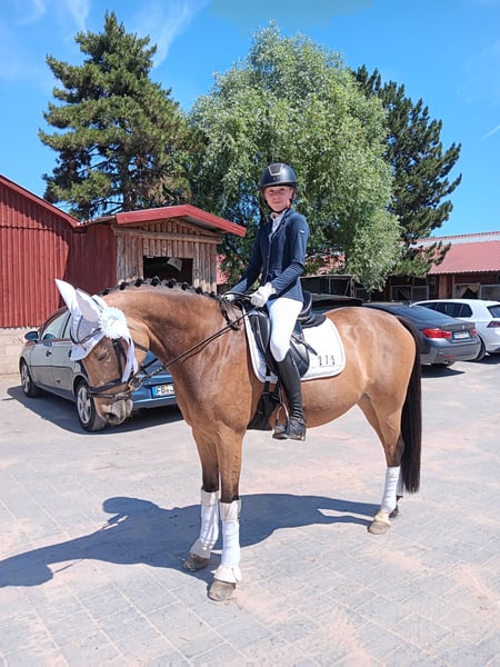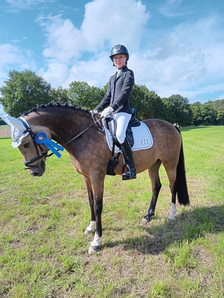 Da die Ponyzeit unserer Tochter zu Ende geht, möchten wir unsere bildschöne Ponystute an ein neues 5-Sterne-Zuhause abgeben. Gini kam als Auktions-Pony Ende 5-jährig zu uns und hat gemeinsam mit meiner Tochter viel gelernt. Das Pony hat sehr gute Grundgangarten und springt mit Vermögen und Vorsicht. Dressurmäßig ist sie auf L-Niveau (geht Außengalopp, springt fliegende Wechsel etc.), im Springen geht sie im Training schon auf A-Niveau. Vor dem Winter haben wir das erste Mal Geländesprünge mit ihr ausprobiert, die sie auf Anhieb mit viel Freude gemeistert hat. Das Pony ist also ein echter Allrounder, mit dem man in allen Disziplinen starten kann. Gini geht auch liebend gerne ausreiten und ist für jeden Spaß zu haben (reiten mit Halsring, springen mit Pad, Reiterferien, Abzeichen etc.). Aufgrund ihrer Qualität wünschen wir uns eine/n sehr gut reitende/n Jugendliche/n oder zierliche Erwachsene, die sie weiter fördert. Wir sehen sie nicht als Anfänger- oder Kleinkinder-Pony, da Gini sportlich geritten werden möchte und die Abwechslung liebt. Die Röntgen-Bilder von Ende 2021 waren ohne Befund. Das Pony war in all der Zeit immer top gesund, ist durchgeimpft und die Zähne sind auch regelmäßig gemacht. Gini steht voll im Training und kann mit ihrer/m neuen Besitzer/in sofort in die Turnier-Saison starten. Natürlich wäre sie als Staatsprämienstute (abstammend von PRH Valerius Dressur M und mütterlicherseits von Vincent, dem Grandseigneur der Ponyzucht) ggfs. auch für Züchter interessant. Gini zählt zu den typischen Nachkommen ihres Muttervaters Vincent, dessen Nachkommen trotz seiner springbetonten Blutführung wider Erwarten oft im Dressurviereck unterwegs sind, fast immer auch über deutliche Doppelveranlagung verfügen und mit Intelligenz, oft auffällig farbenfroher Zeichnung und ansprechend edlem Typ alle Herzen für sich einnehmen. Verkauf von Privat. Anfragen bitte nur bei ernsthaftem Interesse und nur telefonisch!