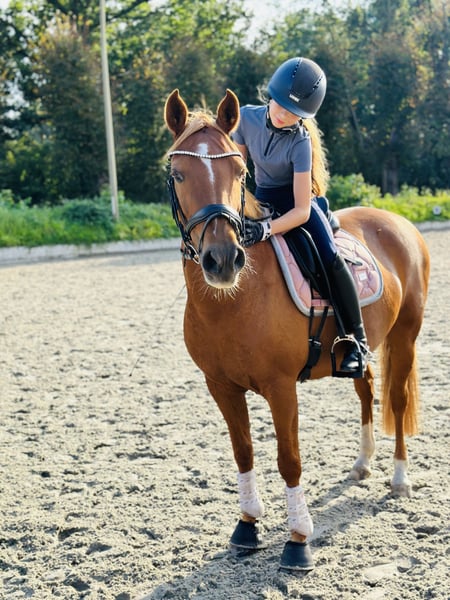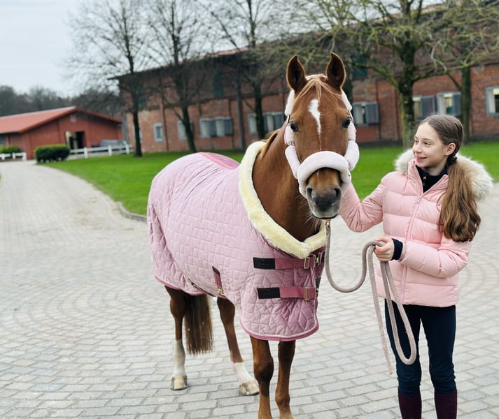 Madita is a dream come true — a picture-perfect children's pony through and through. She loves children! Unfortunately, Madita suffered a suspensory ligament injury on her left hind leg about a year and a half ago. She has been retrained and is now sound, but she is no longer suitable for sport riding. She is free of lameness. However, she can be ridden casually by light riders up to 50 kg. She is gentle to ride, easy to handle even for small children and inexperienced riders. Always sweet and very cuddly. She responds well to voice commands and can be ridden with just a halter or halter ring. Madita is nerveless, cautious, and very attentive. She is a registered broodmare and has already foaled. She takes this easily. Madita comes with all the accessories that can be purchased, including a well-fitting dressage saddle from Passier, winter and rain sheets, and a cooling blanket. She is barefoot. Selling her is very, very difficult for us. My daughter has outgrown her and also wants to ride in sport. Madita is such a loving pony that we are looking for a family who will enjoy her and share many happy moments with her.