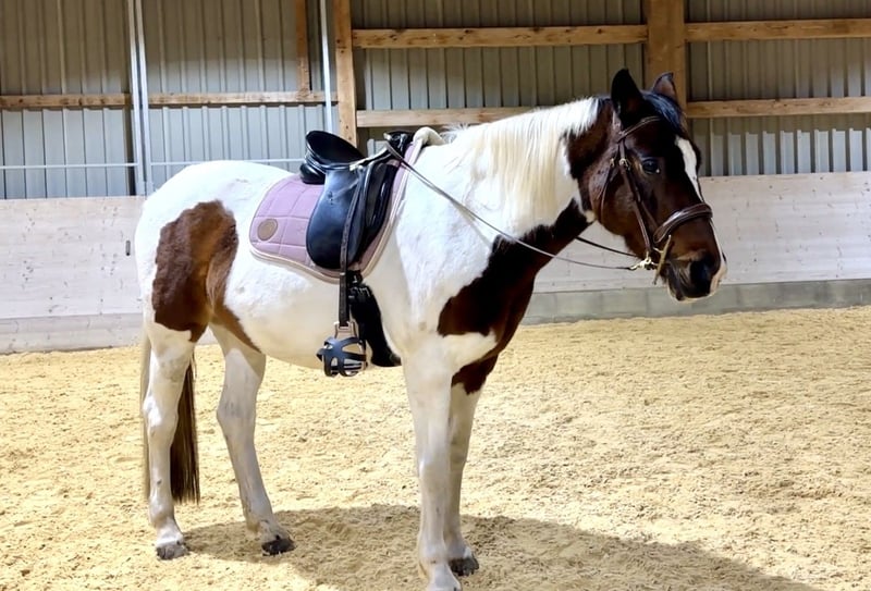 Why am I selling this wonderful horse? 1. I don’t enjoy riding out alone – unfortunately, opportunities for group rides are just too rare for me. 2. Since my pony has a very relaxed temperament and I am also a calm rider with a rather light seat, it doesn’t work well with us in the riding arena (video available – trainer present). Therefore, I am looking for the perfect match for my beloved Endmaß pony mare (born 2012, 14.8 hh). I am sure a rider who is confident to ride alone and exudes good, active energy will have a lot of fun with her. In the field and traffic, she is fearless and not afraid of large machines, trucks, trailers, or dogs. She is a bit “curious” around cows but can pass them without needing to dismount. In a group, she likes to stay at the back but also confidently leads if the other horse stops. She handled an extreme trail course with ease, jumping all obstacles along the way. She is very well-behaved in handling, no bucking, rearing, kicking, or biting. She is an exemplary student during hoof care and enjoys being groomed without fidgeting. She loads into the trailer without issues. She watches over the rider and will stop if the rider becomes unbalanced. She enjoys lunging and equikinetics, and can also wibble-wobble. The mare has been with me since March 2021 and lives in a spacious open stable with limited turnout. She feels very comfortable in the mixed herd, is somewhat lower in rank, and avoids conflicts. It is important to me that she continues to live in a good open stable or similar environment with as much turnout and movement as possible. She is easy to feed. This is not an emergency sale. Inquiries from dealers or interested parties without proof of turnout or similar arrangements are pointless. Of course, I continue to train her with groundwork and she is ridden once a week by my trainer. My pony is fit, healthy, allergy-free, and not an Eczema horse. Further information about her pedigree etc. available upon request. German Riding Pony, L.St. S1 (DR) Premium foal at birth Born in 2012 Height: 14.8 hh Klebe shoes front and back Price: €6,999 Including bridle, leather halter, rope halter, and three blankets (100, 50, 0). The saddle can be purchased for €500. To prevent riding tourism, trial riding is only possible for €35 (deductible from the purchase price).