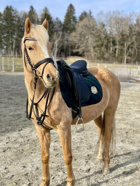 Dieses süße Barbiepony sucht ein traumhaftes „Für Immer Zuhause“– ideal für Freizeit und Hobby! Hier geht für mich auf alle Fälle Platz vor Preis! Diese wunderschöne Palomino-Stute wurde im Jahr 2008 geboren und überzeugt durch ihr freundliches Wesen sowie ihre Vielseitigkeit. Mit einem Stockmaß von 142 cm ist sie perfekt für Reiter, die ein zuverlässiges und charmantes Pferd suchen. Sie ist ein echtes Freizeitpferd, das sowohl im Gelände (am liebsten in Begleitung eines Artgenossen) als auch in der Dressur Freude bereitet doch noch mehr Spaß am Springen hat. Durch ihre Arbeitsbereitschaft und Lust an der Bewegung ist sie optimal für erfahrenere Reiter die sich einen treuen Begleiter an ihrer Seite wünschen. (Im Preis ist Zubehör inklusive) Bei Interesse oder für weitere Informationen stehe ich gerne zur Verfügung. Ein Kennenlernen lohnt sich!