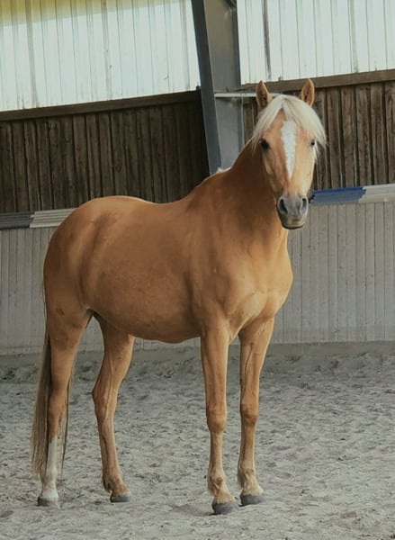 German Riding Pony mare for sale – ideal for leisure and recreational riding! This beautiful Palomino mare was born in 2008 and impresses with her friendly temperament and versatility. Standing at 142 cm, she is perfect for riders seeking a reliable and charming pony. She is a true leisure horse, enjoying both trail riding (preferably in the company of a pasture mate) and dressage, but she also has a particular passion for jumping. Thanks to her willingness to work and love of movement, she is ideally suited for more experienced riders looking for a loyal companion. Please feel free to contact me for more information or if you are interested. A personal meeting is highly recommended!