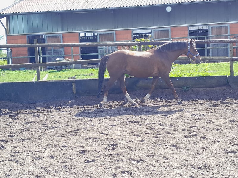 Almost 18-year-old German Riding Pony mare, chestnut with a stylish appearance, available for personal reasons. Limited riding ability; suitable as a ground work pony or companion horse with some handling.