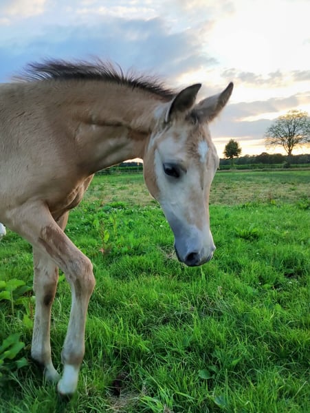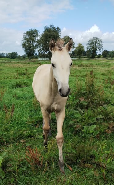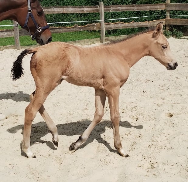 Absolutely lovely mare! She not only impresses with her desirable color and XXL size but also boasts three very good basic gaits. Her excellent conformation, overall balance, and very active hind leg further highlight her qualities. Additionally, she features a very good neck set and, once fully grown, will develop into a stallion-type mare. In terms of temperament, she is somewhat subordinate, always approachable and cooperative, and has never taken a wrong step. Thanks to her lovable character, we believe she will also be suitable for amateurs. Her dam was a warmblood mare, Verb. Pr. St. Favarella (Fürst Grandios x St. Tropez x Frühlingsball). The sire is Dating AT. Estimated final height between 15.3 and 16.0 hands. Please contact us only by phone or WhatsApp at 015755218756 and only if you are genuinely interested.