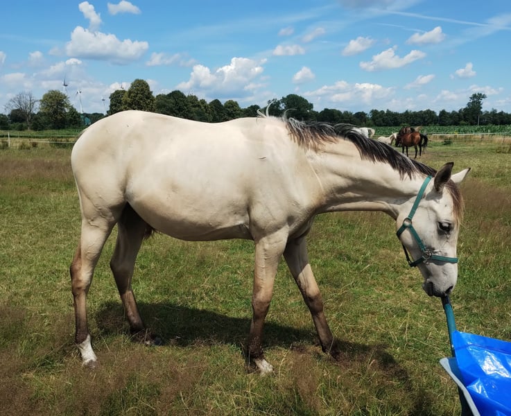 Ganz tolle Stute! Sie kann nicht nur in begehrter Farbe und im XXL Format punkten. Sie verfügt über drei sehr gute Grundgangarten und besticht desweiteren durch ihr einwandfreies Fundament, Geschlossenheit und ein sehr aktives Hinterbein. Zudem besticht sie mit einer sehr guten Halsung und wird ausgewachsen eine im Hengsttyp stehende Stute sein. Charakterlich ist sie eher rangniedrig, immer aufgeschlossen, kooperativ und hat noch nie einen falschen Tritt gemacht. Durch ihren liebenswerten Charakter können wir uns vorstellen, dass sie auch amateurgeeignet sein wird. Die Mutter war eine Warmblutstute Verb. Pr. St. Favarella (Fürst Grandios x St. Tropez x Frühlingsball). Vater ist Dating AT. Geschätzte Endgröße zwischen 1,55 - 1,60. Bitte Kontaktaufnahme nur telefonisch oder per WhatsApp 015755218756 und nur bei ernsthaftem Interesse.