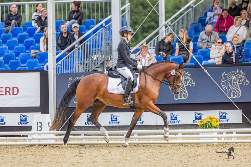 For sale is our charming, very people-oriented mare Raute. Raute was born with us and grew up in a herd environment with plenty of turnout. She is a state premium candidate (1 c prize) and was placed in the finals of the 3-year-old mares and geldings at the Bundeschampionat in Warendorf. Thus, she is the 4th best mare in the breeding book for German Riding Ponies of the 2022 crop. Raute has been gently started under saddle with us and is now being slowly prepared for a riding break after the championship. Particularly noteworthy is Raute's outstanding walk and her very elastic basic gaits, which were rated with scores of 8 and 9 at the elite mare show and in the riding horse tests. Raute has only had 3 starts in riding horse tests and has always been placed. A jewel for the big sport is maturing here. Raute's mother "Rominas Royal Lady WE" comes from the renowned breeding establishment Gestüt Kastanienhof/Coldewey. She is also a state premium candidate and was 3rd at the mare championship in Lienen. Not much needs to be said about Raute's father Dreidimensional AT; he is a multiple Westphalian and Bundeschampion and has already produced numerous licensed stallions and state premium daughters. Raute has never been seriously ill and has already been examined radiologically with no findings. She is being sold with a heavy heart into appreciative and supportive hands. If you are interested or have any questions, please feel free to contact me.