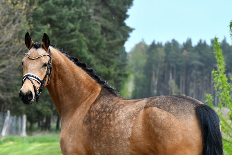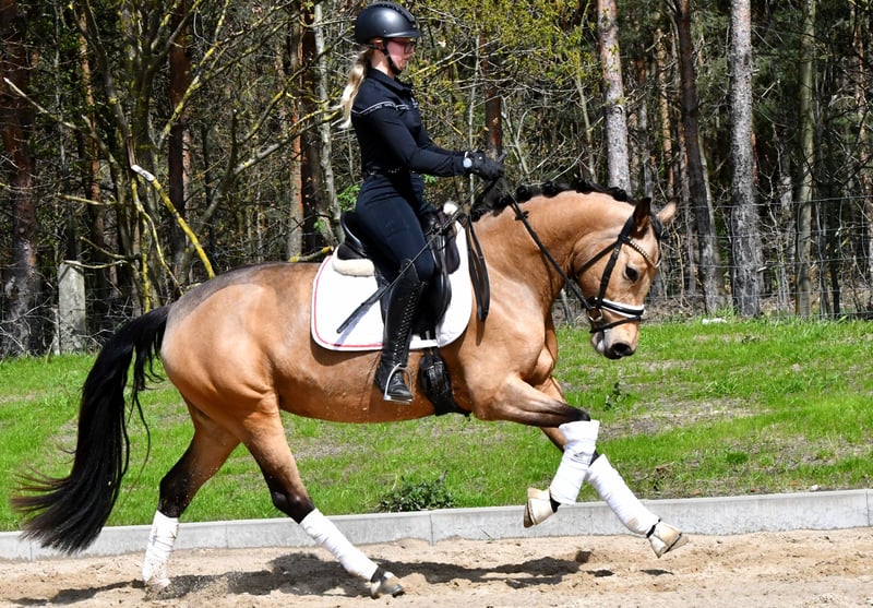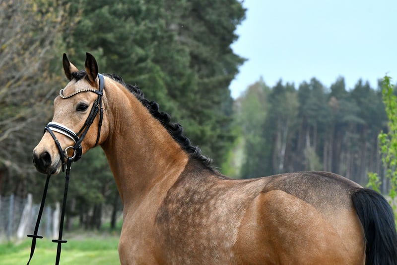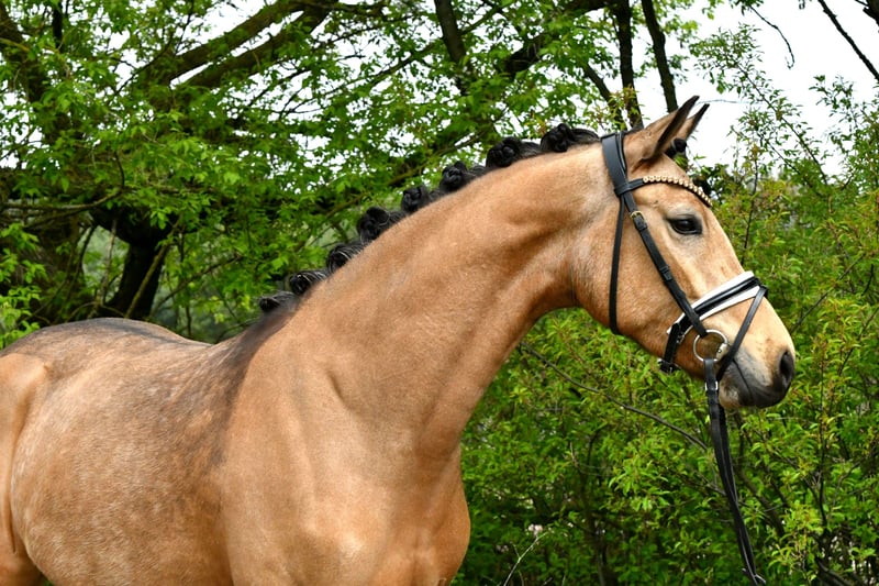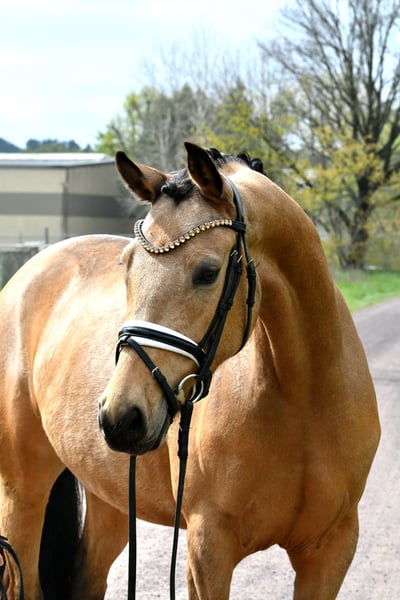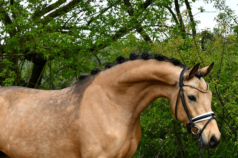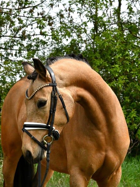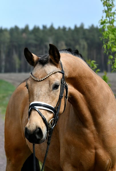 "Glory" arrive directement de l’élevage avec une inspection récente – une jument très douce avec une belle apparence. Bien qu’elle soit encore au début de sa formation, elle se distingue déjà par son tempérament facile. Ses bonnes allures de base laissent envisager un avenir prometteur en dressage – avec une formation supplémentaire, elle sera sûrement adaptée plus tard en tant que poney pour enfants. Un certificat vétérinaire très satisfaisant, incluant le dos et le cou (sans anomalies), est bien entendu disponible. Venez la voir et tomber sous son charme !