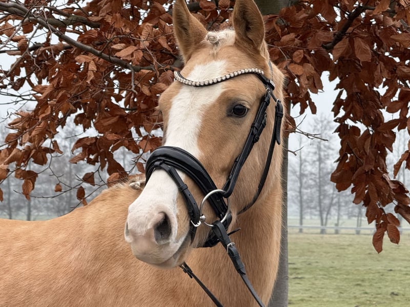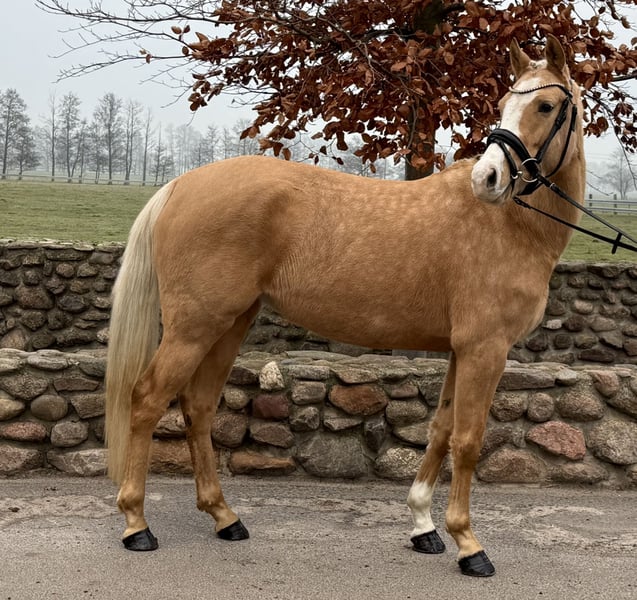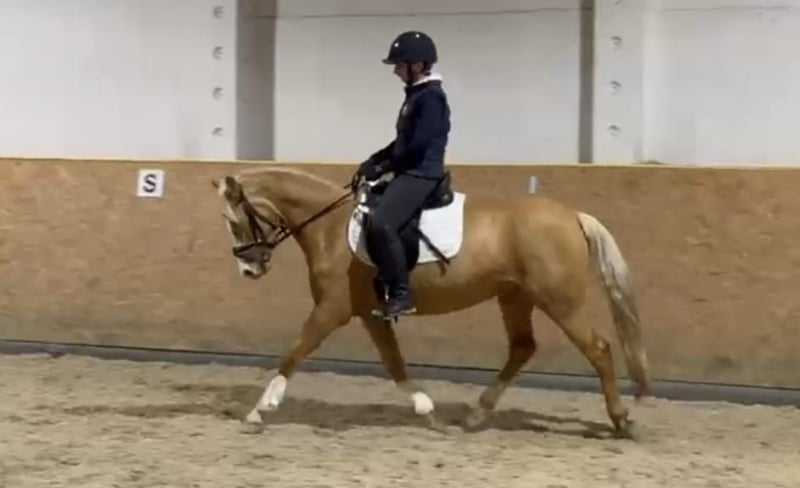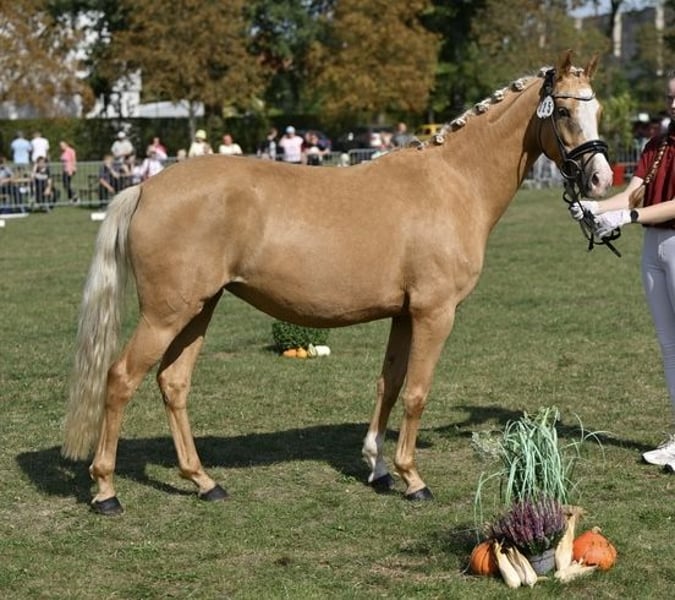 For sale is a 4.5-year-old German Riding Pony State Premium mare in the stunning Palomino color. She impresses not only with her friendly, people-oriented nature but also with her excellent basic gaits and her ambition under saddle. She is easy to ride for everyone and a joy to sit! She is very well-behaved and absolutely reliable, making her an ideal children’s pony. She is highly eager to learn, clear-minded, and pleasant to work with daily. She successfully completed her performance test and was awarded the State Premium mare title in September. She has excellent potential for sport and breeding. Her training is appropriate for her age, and she shows great talent for further development. Perfect as a family pony, children’s pony, or young sport horse. A mare that captivates with her quality, character, and color – a true treasure for a family, competitive riding, or breeding. A current TÜV inspection with no findings is available! Further information, videos, and viewing by arrangement.