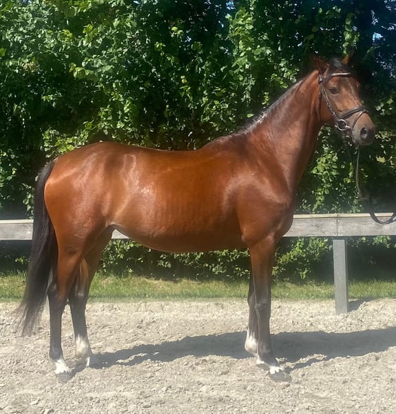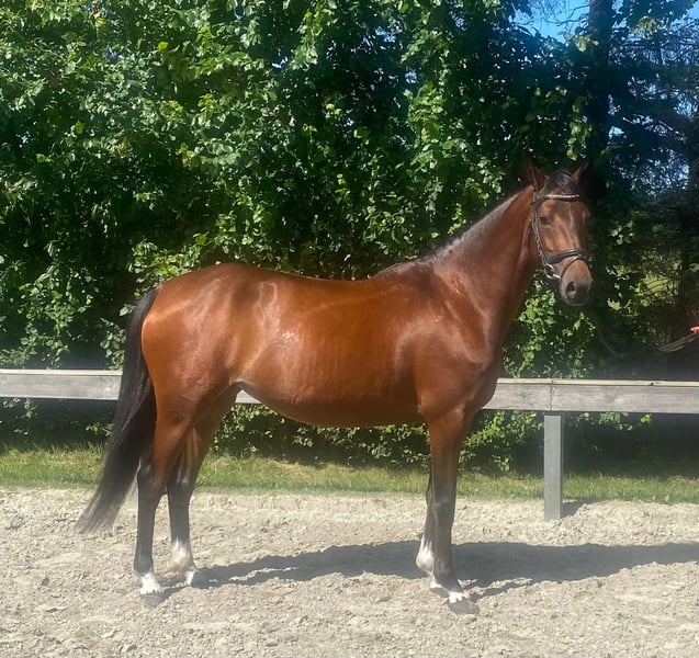 **Sales Advertisement: German Riding Pony Mare** For sale is a beautiful, talented mare of the German Riding Pony breed. **Features:** - **Breed:** German Riding Pony - **Gender:** Mare - **Year of Birth:** 2021 - **Color:** Brown - **Height:** 147 cm This charming mare shows great potential in jumping and is suitable for both experienced riders and ambitious beginners who wish to further develop their skills. She is well-mannered, easy to handle, and has a friendly character. The mare is healthy, regularly vaccinated, and dewormed. She has already gained initial experience in training and shows a lot of joy and willingness to perform. If you are interested or have further questions, please feel free to contact me. Viewings and trial rides are possible by arrangement. We look forward to your message!
